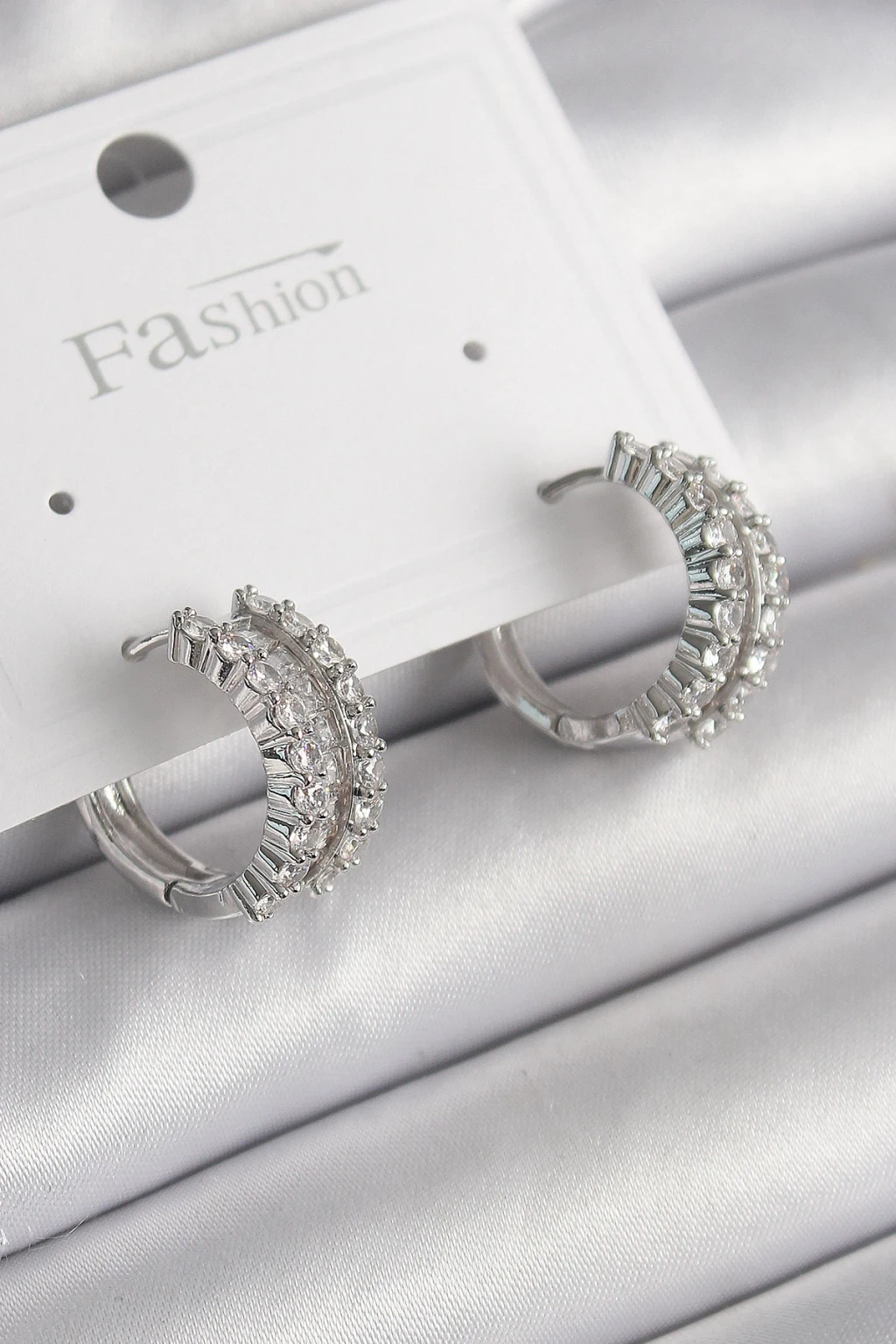 Pirinç Gümüş Renk Zirkon Taşlı Halka Model Kadın Küpe - TJ-BKP9966