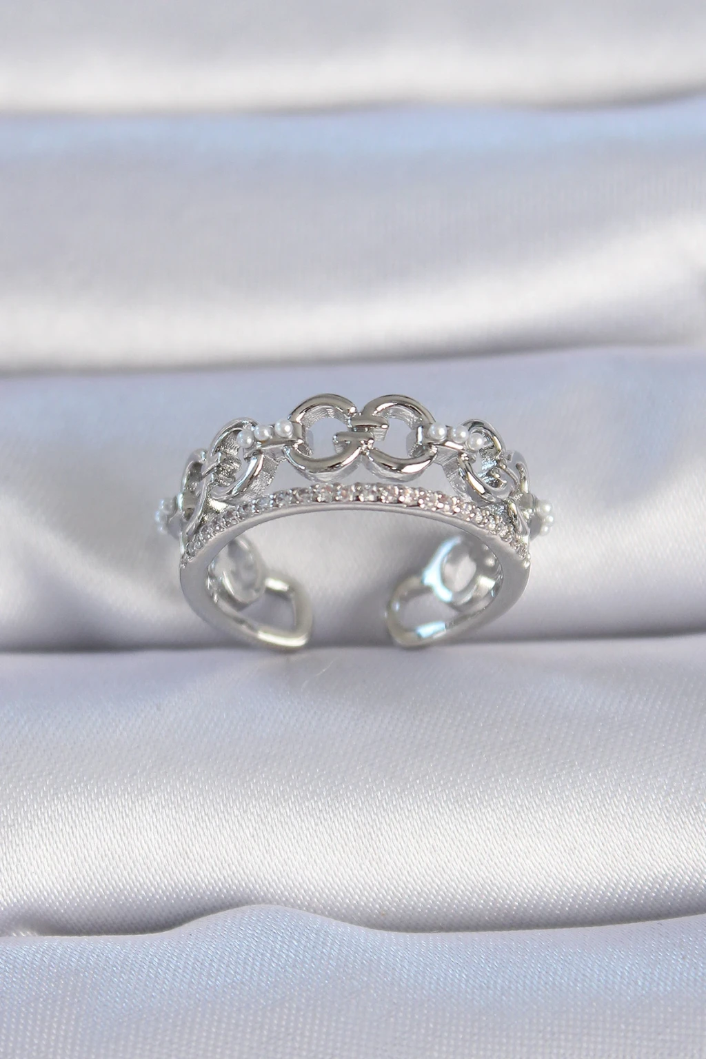 Pirinç Gümüş Renk Zirkon Taşlı İnci Detay Kadın Yüzük - TJ-BYK3335