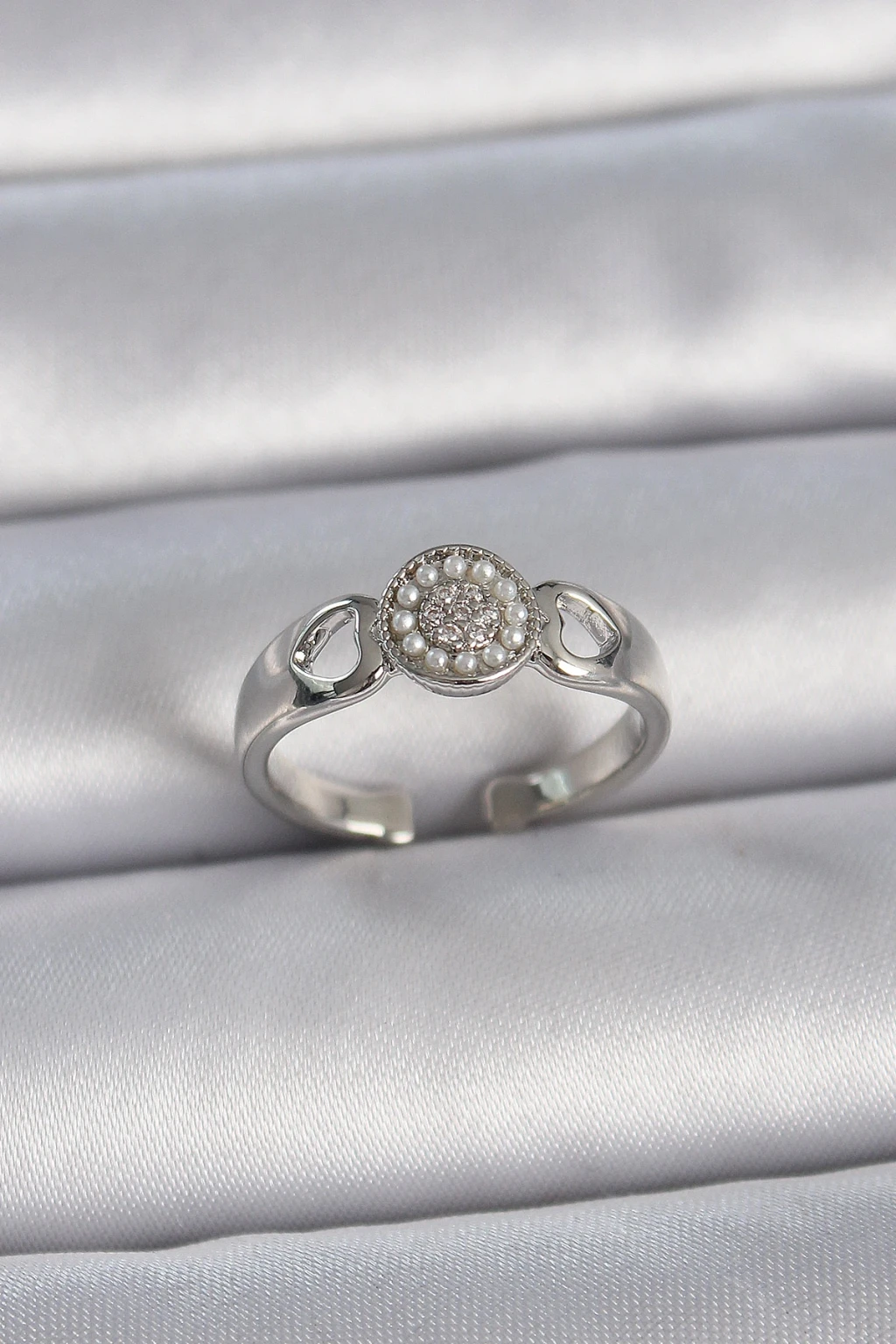 Pirinç Gümüş Renk Zirkon Taşlı İncili Kalp İşleme Detay Ayarlanabilir Model Kadın Yüzük - TJ-BYK3359