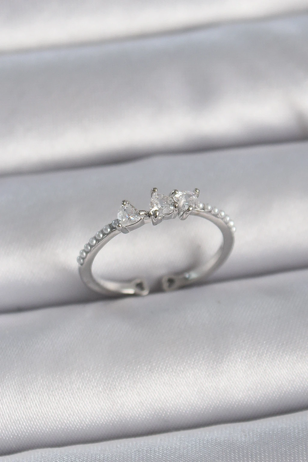 Pirinç Gümüş Renk Zirkon Taşlı Kalp İnci Detay Ayarlanabilir Model Kadın Yüzük - TJ-BYK3363