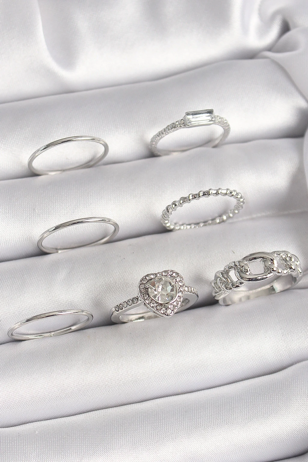 Pirinç Gümüş Renk Zirkon Taşlı Kalp Model Kadın Yüzük Kombini - TJ-BYK3661