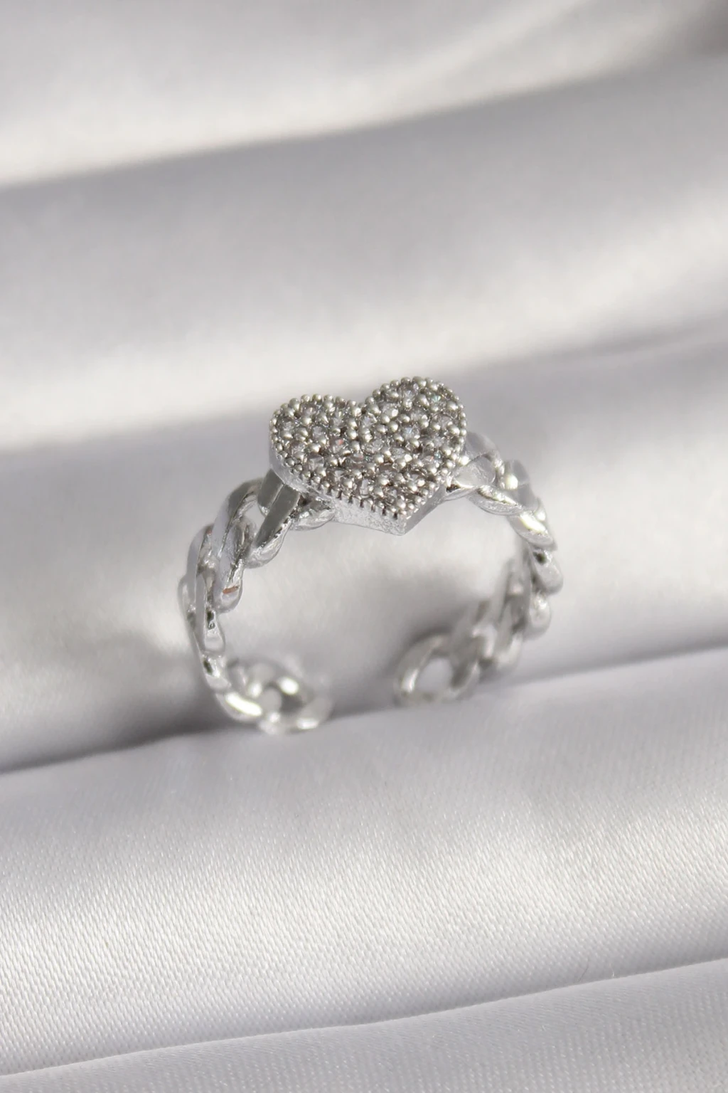 Pirinç Gümüş Renk Zirkon Taşlı Kalp Model Kadın Yüzük - TJ-BYK3093