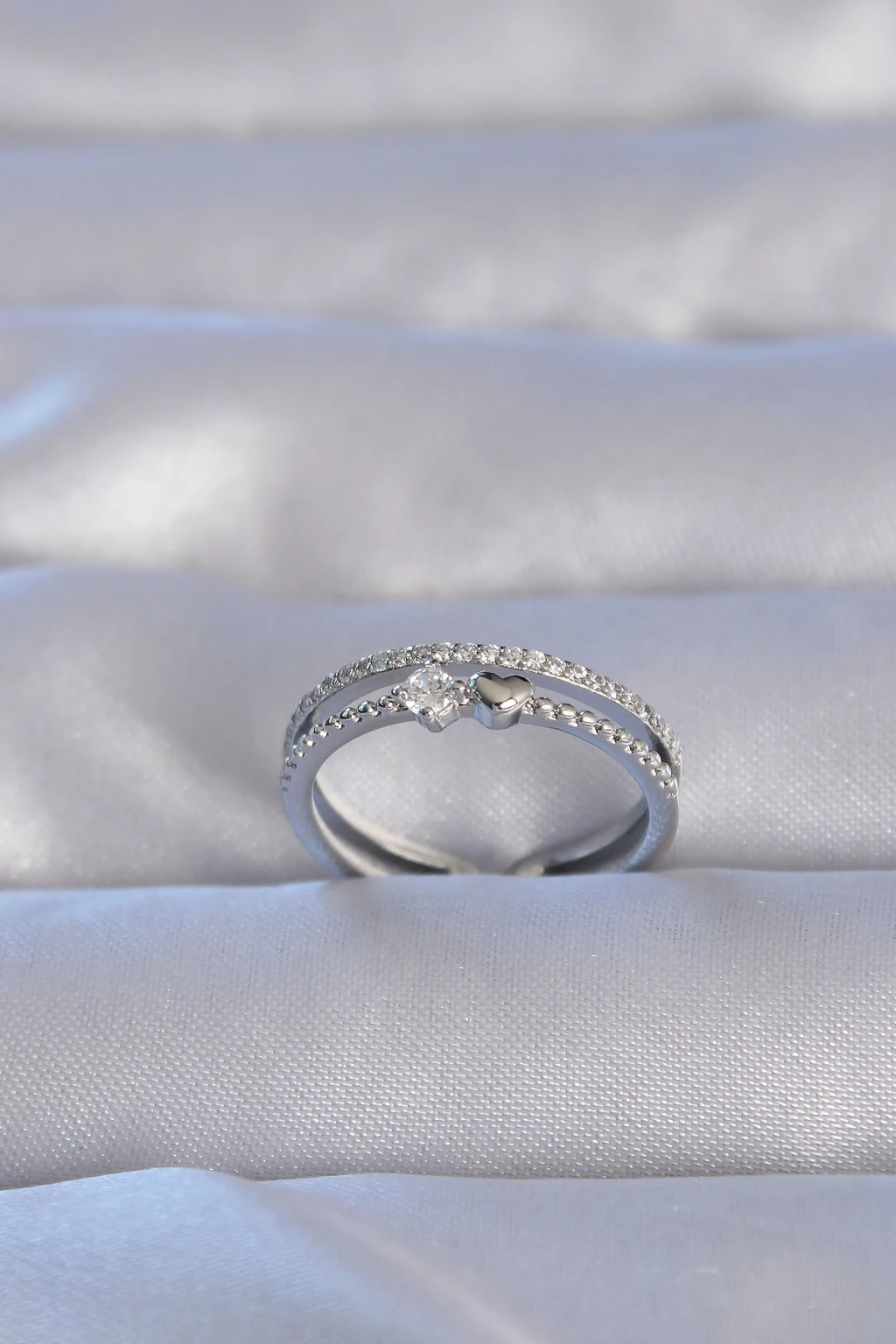 Pirinç Gümüş Renk Zirkon Taşlı Kalpli Su Yolu Model Ayarlanabilir Yüzük - TJ-BYK3220