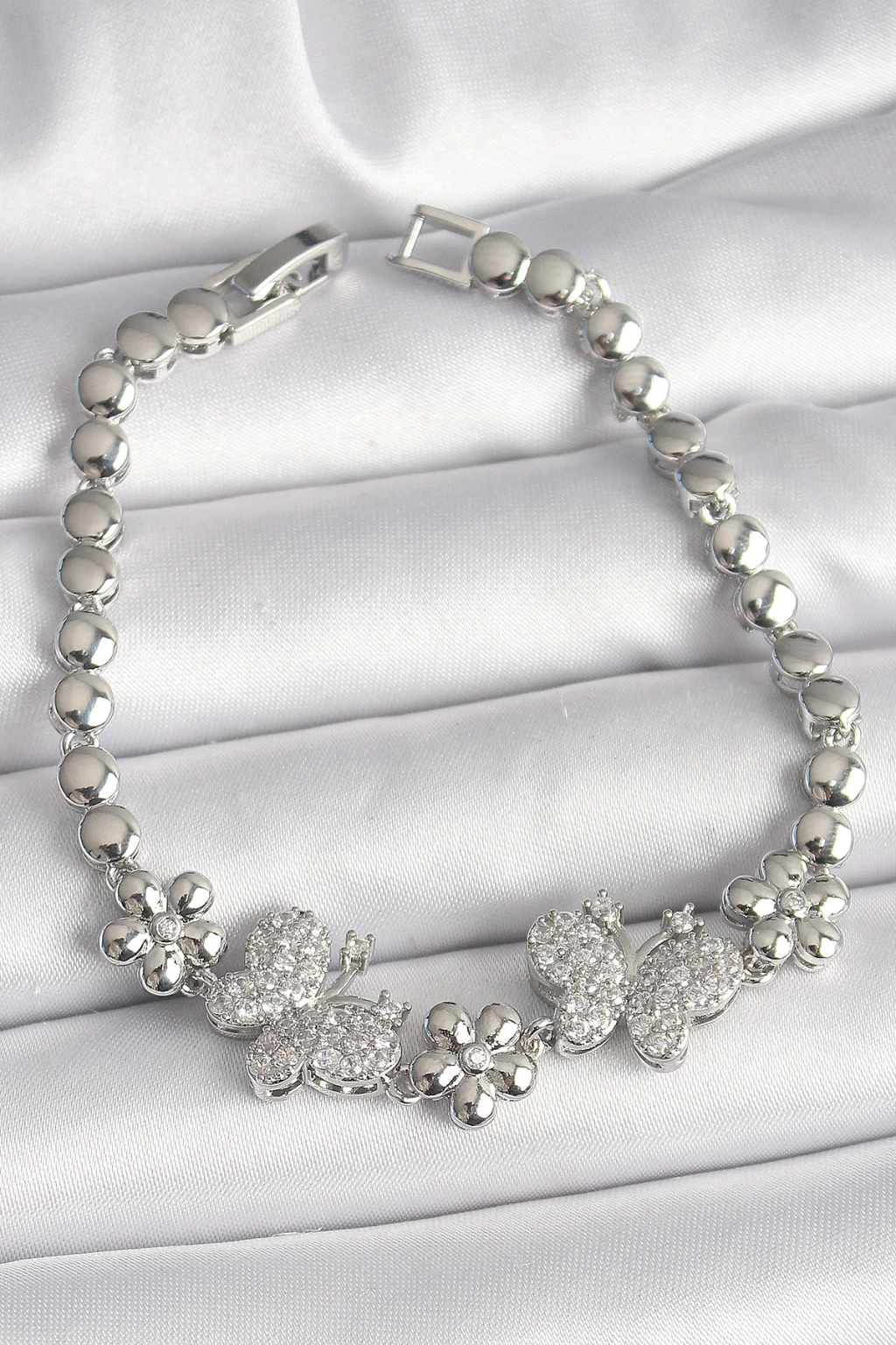 Pirinç Gümüş Renk Zirkon Taşlı Kelebek Figür Çiçek Zincir Model Kadın Bileklik - TJ-BB6827