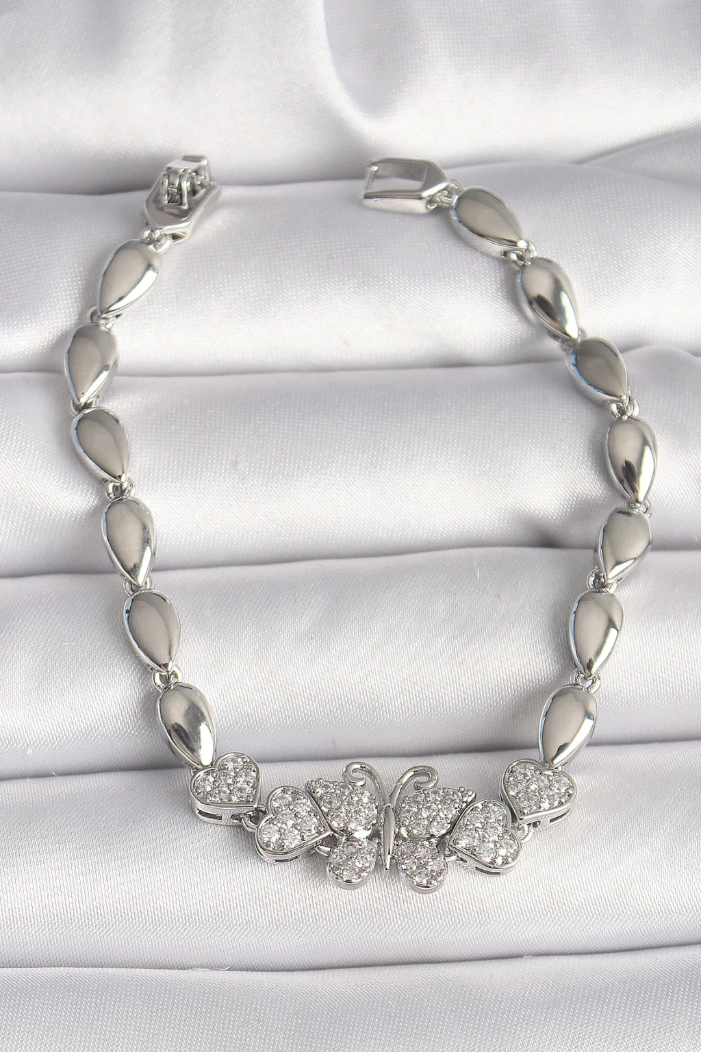 Pirinç Gümüş Renk Zirkon Taşlı Kelebek Figür Damla Zincir Model Kadın Bileklik - TJ-BB6841