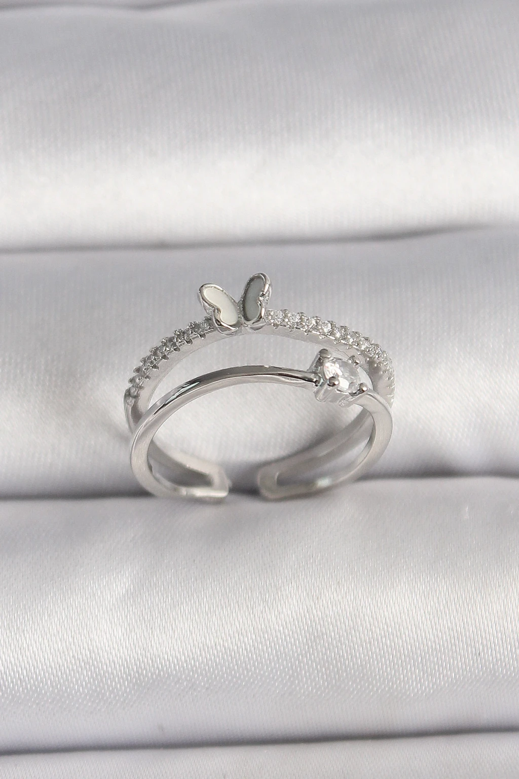Pirinç Gümüş Renk Zirkon Taşlı Kelebek Figürlü Ayarlanabilir Yüzük - TJ-BYK3528