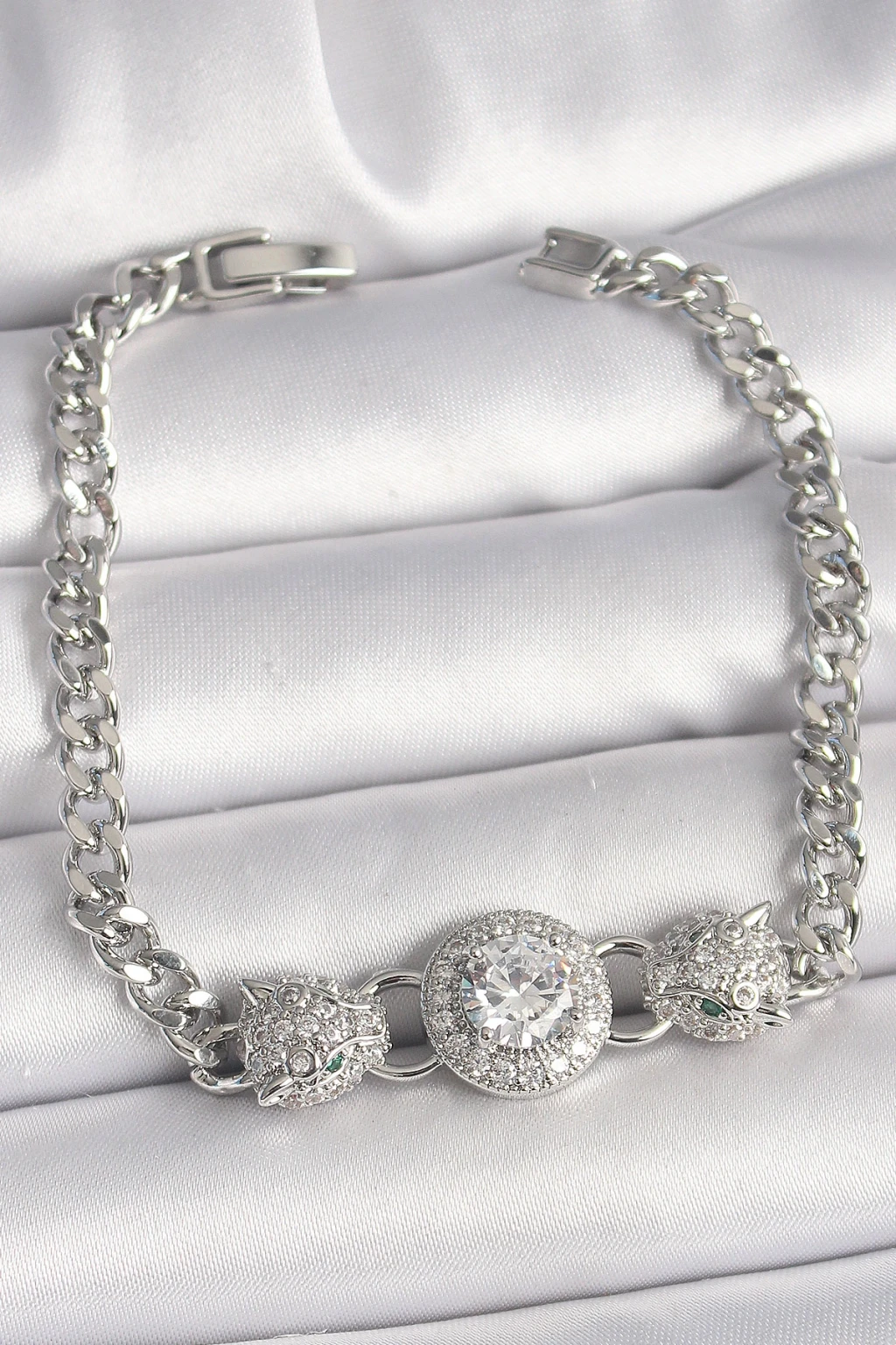Pirinç Gümüş Renk Zirkon Taşlı Leopar Figür Zincir Model Kadın Bileklik - TJ-BB6829