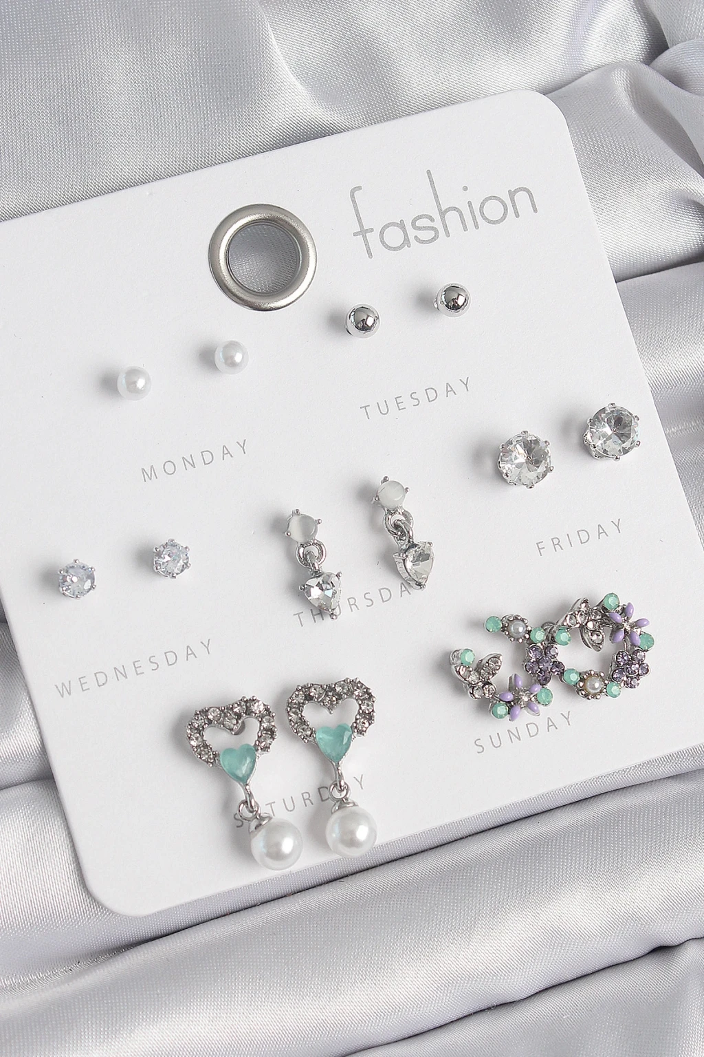 Pirinç Gümüş Renk Zirkon Taşlı Sallantılı Kalp Model Çiçek Detay 7 Çift Kadın Küpe Seti - TJ-BKP10546