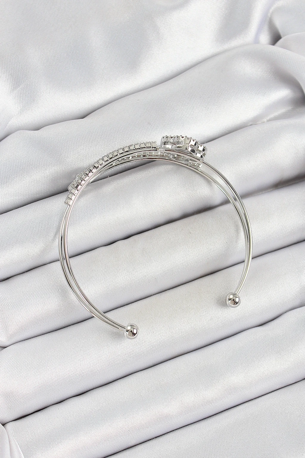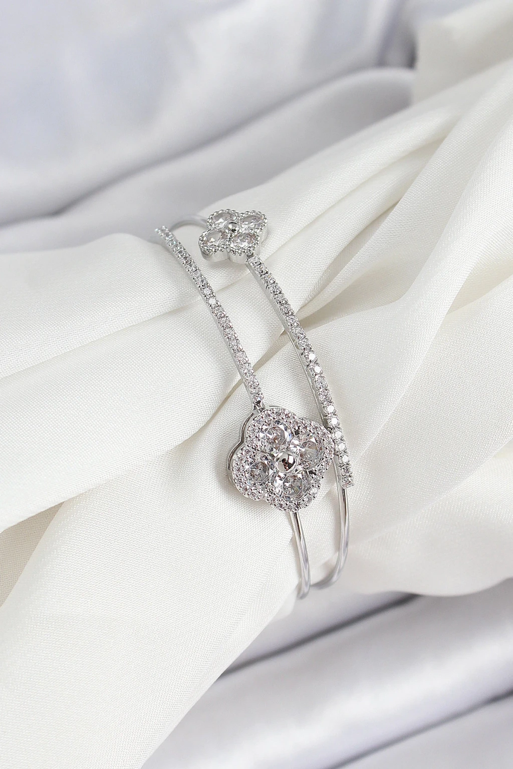 Pirinç Gümüş Renk Zirkon Taşlı Yonca Model 2'li Kadın Bileklik - TJ-BB7063