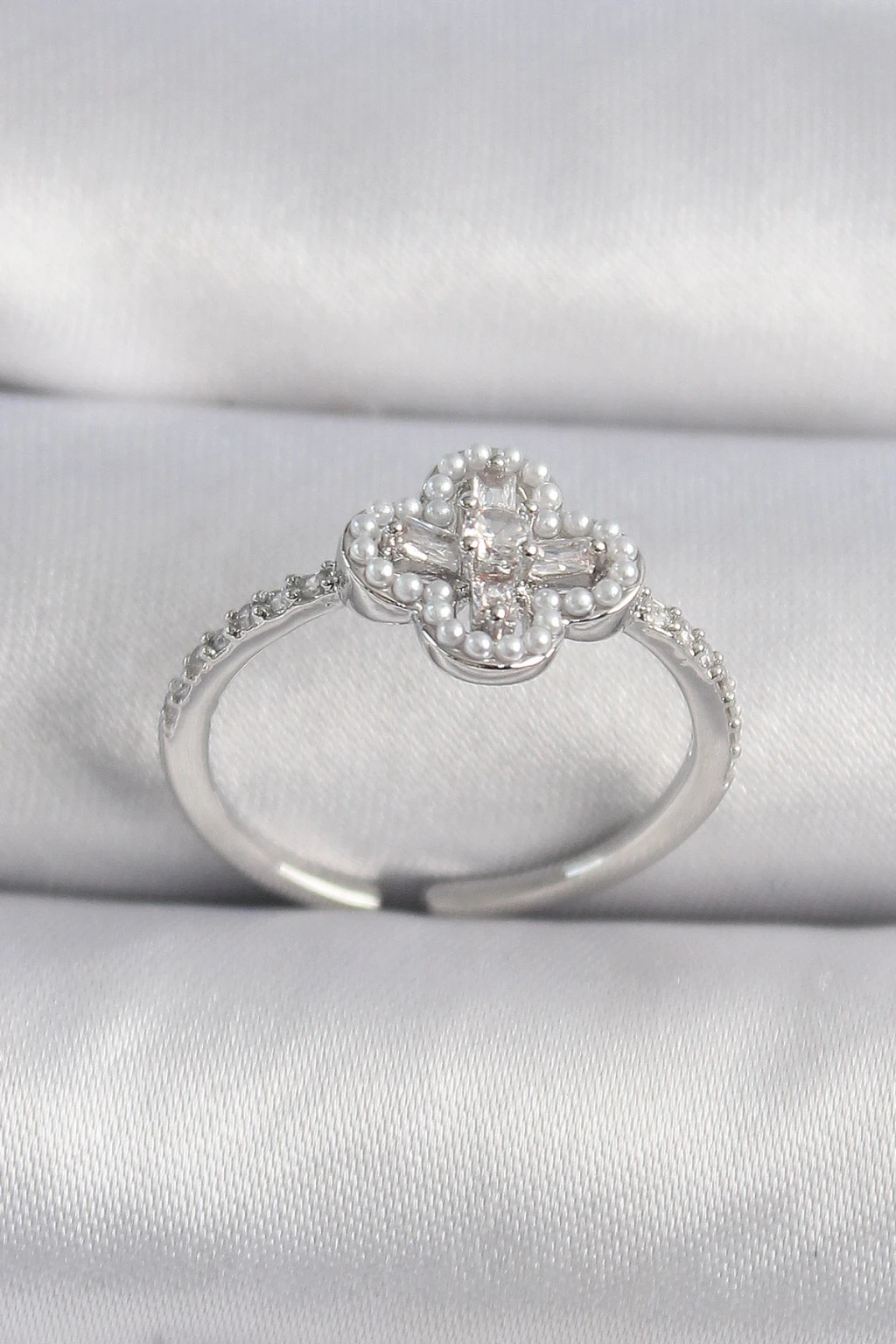 Pirinç Gümüş Renk Zirkon Taşlı Yonca Model İnci Detay Kadın Yüzük - TJ-BYK3493