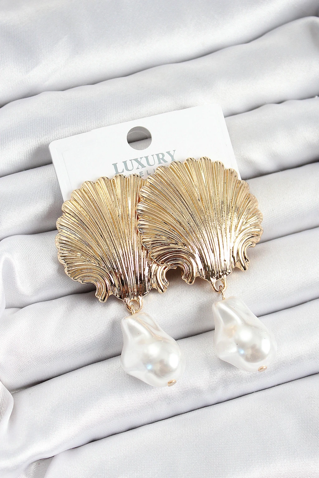 Pirinç İstiridye Model Sallantılı İnci Detaylı Gold Renk kadın Küpe - TJ-BKP10745