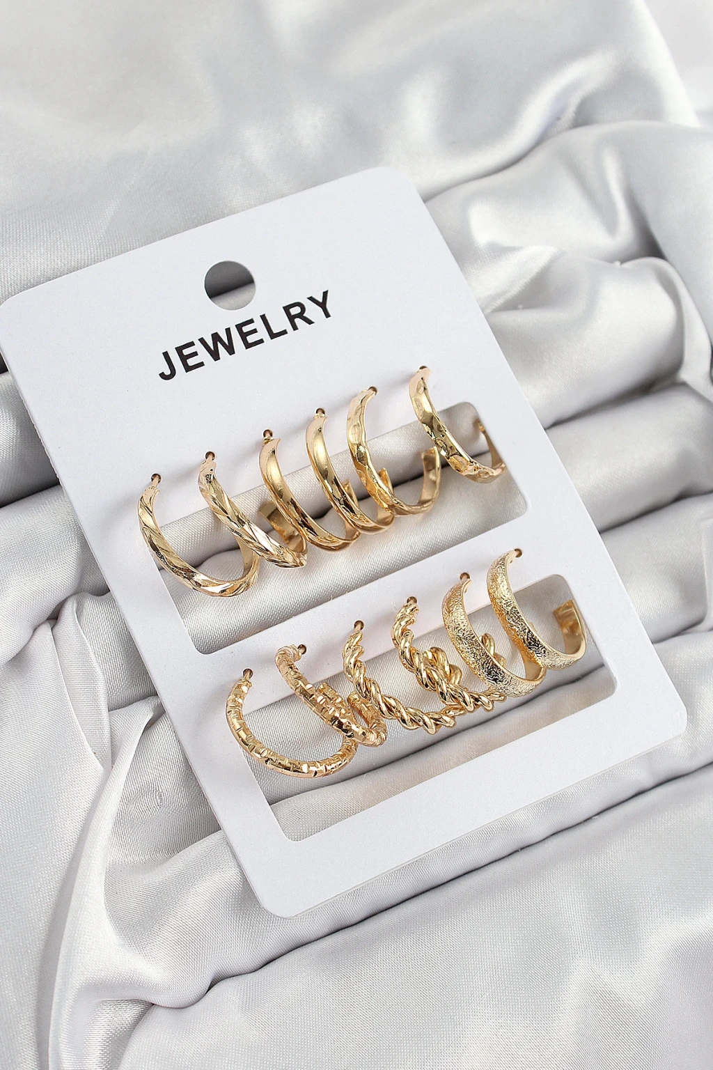 Pirinç Karışık Halka Model Gold Renk 6 Çift Kadın Küpe Set - TJ-BKP10882