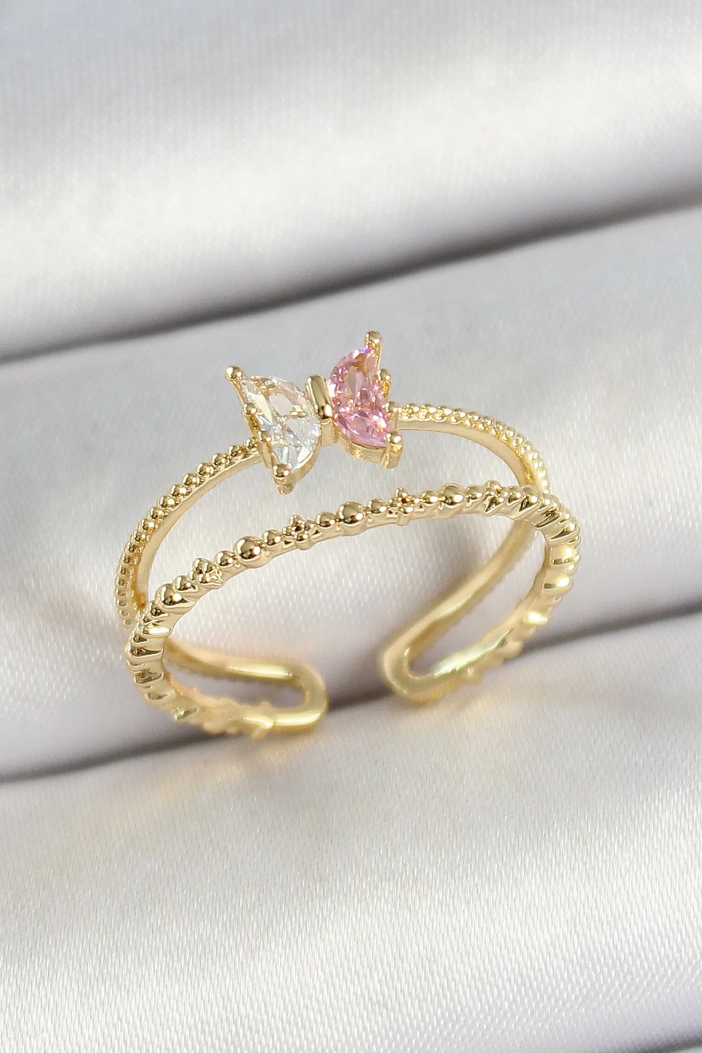 Pirinç Ayarlamalı Gold Renk Zirkon Taşlı 2li Görünüm Fiyonk Yüzük - TJ-BYK3287