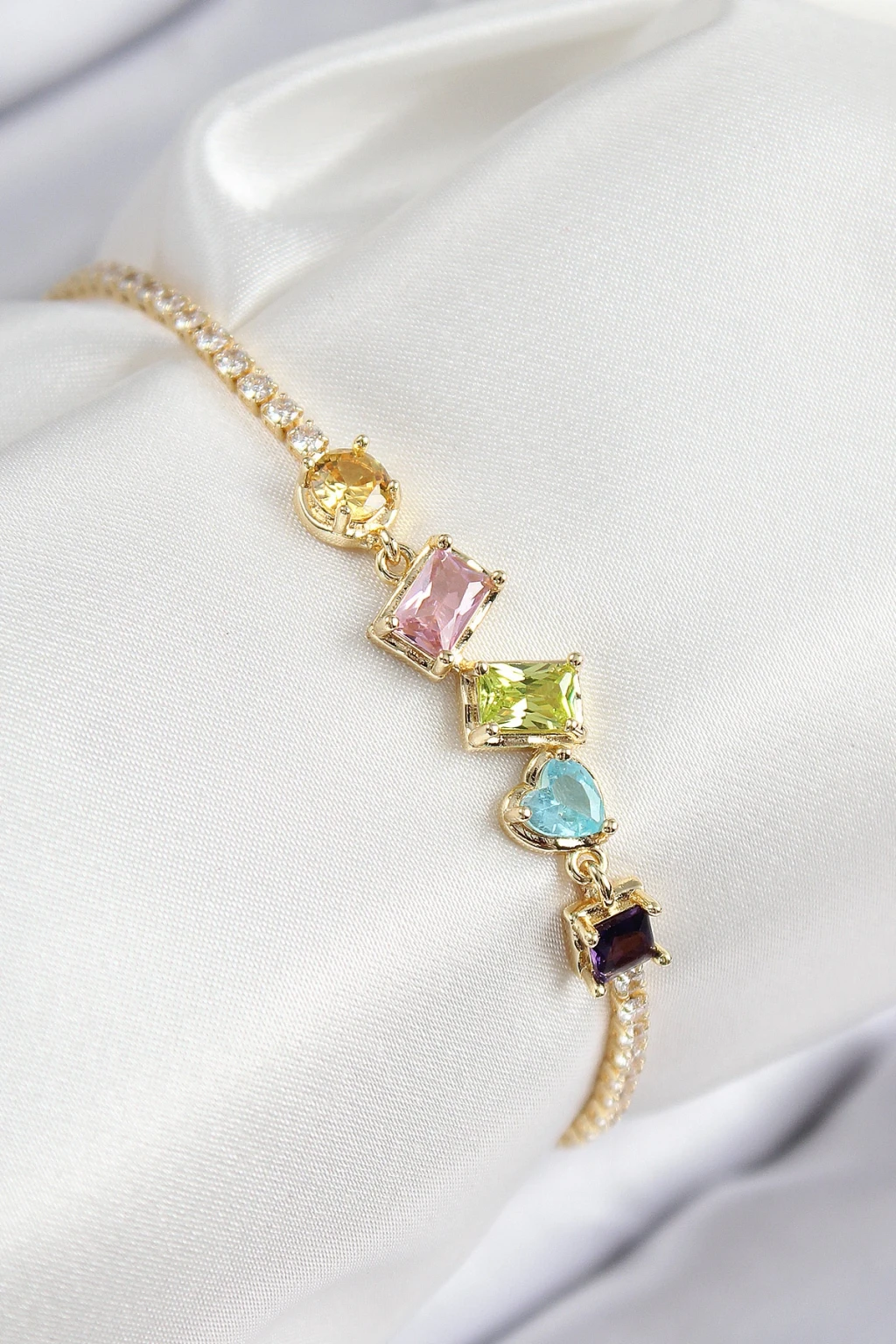 Pembe Zirkon Taşlı Kalp Model Gold Renk Kadın Bileklik - TJ-BB8001