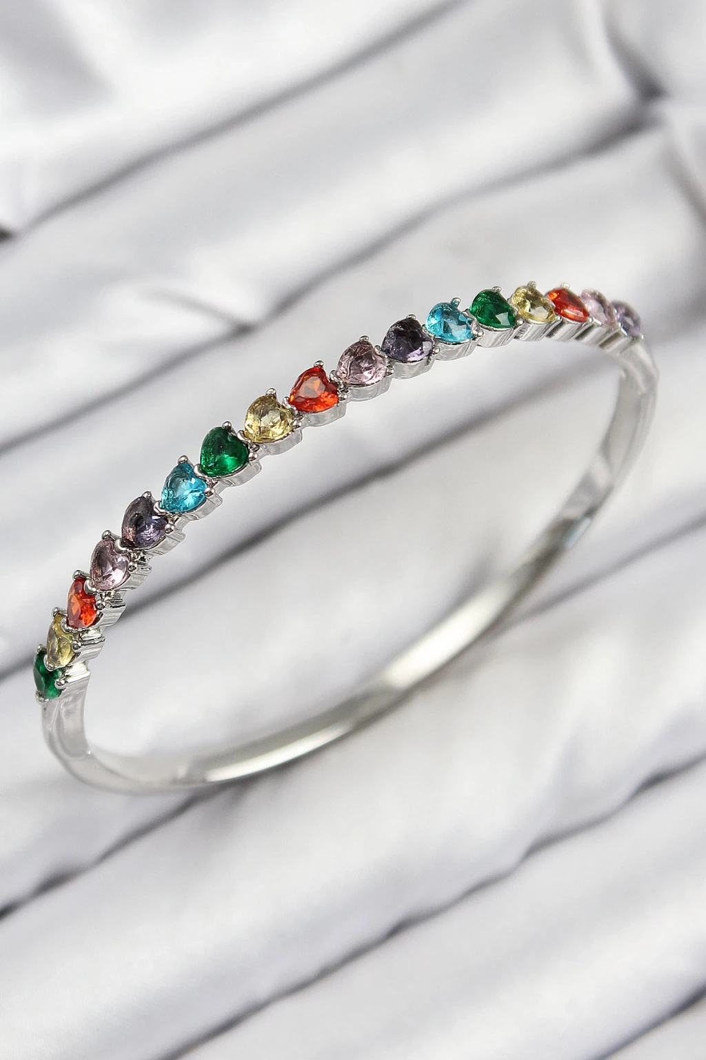 Pirinç Renkli Zirkon Taşlı Kalp Model Gümüş Renk Kadın Kelepçe - TJ-BB7679