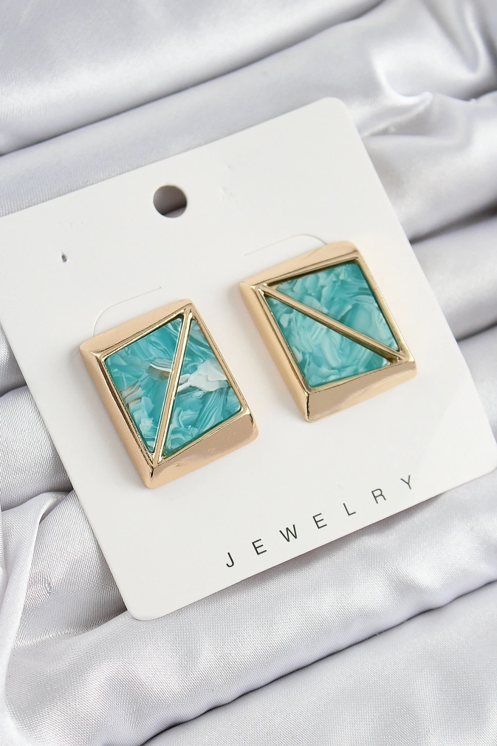Pirinç Turkuaz Üçgen Kesim Detaylı Kare Model Vintage Gold Renk Kadın Küpe - TJ-BKP10873