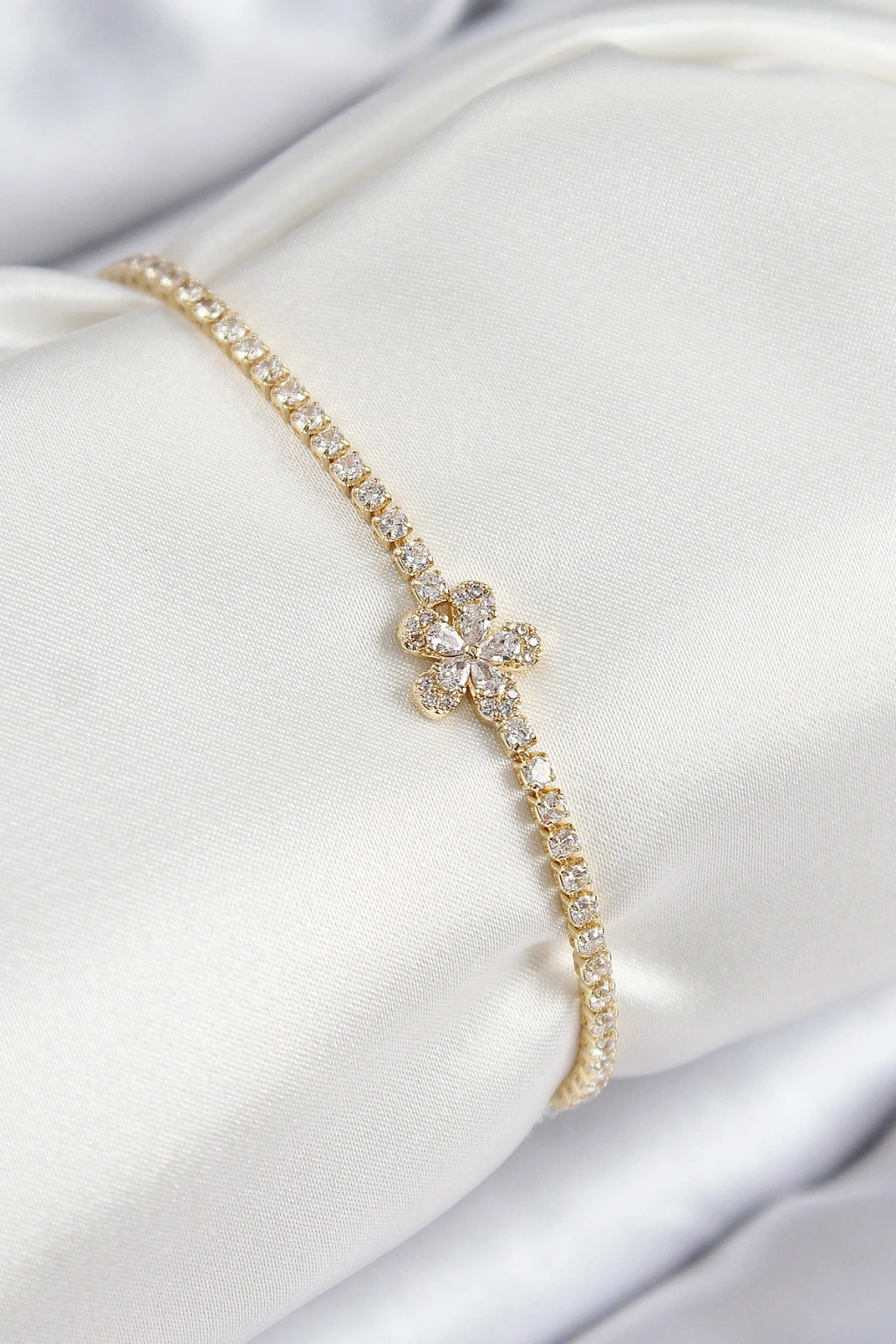 Pirinç Zirkon Taşlı Çiçek Model Gold Renk Kadın Bileklik - TJ-BB7709