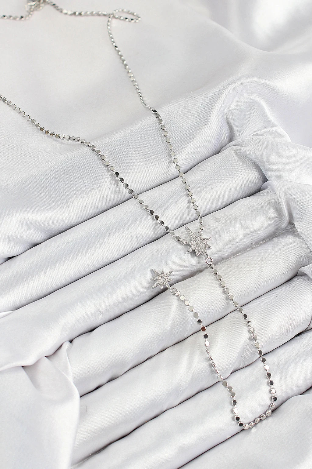 Pirinç Zirkon Taşlı Ezme Zincirli Kutup Yıldızı Model Gümüş Renk Y Kolye - TJ-BKO10462