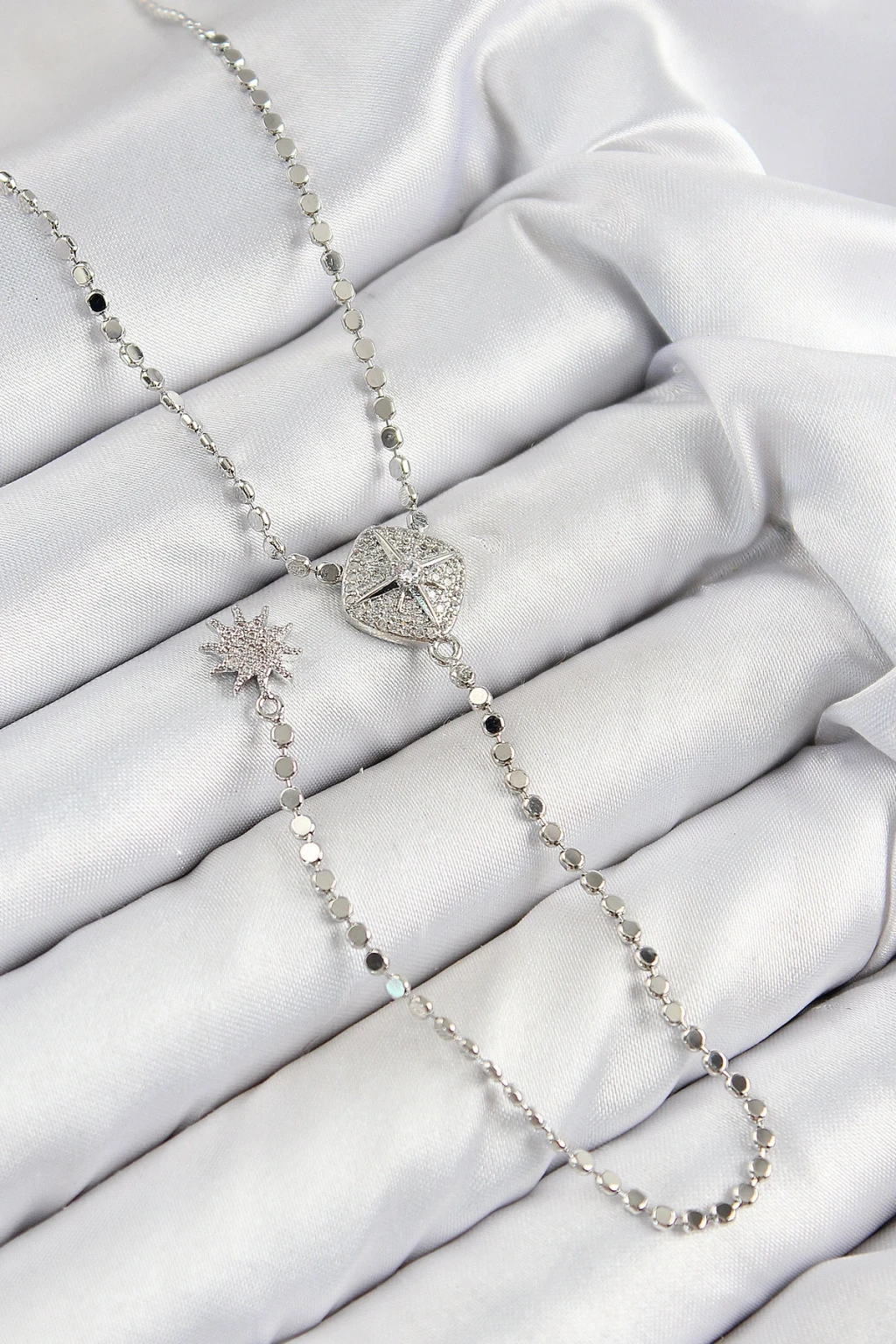 Pirinç Zirkon Taşlı Ezme Zincirli Madalyon Model Gümüş Renk Y Kolye - TJ-BKO10470