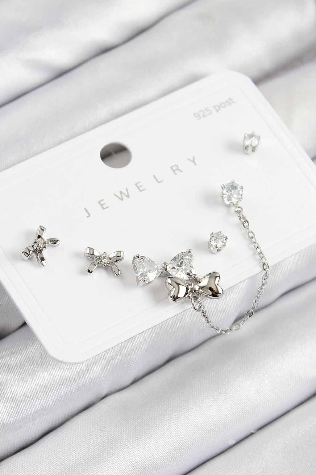 Pirinç Zirkon Taşlı Fiyonk Model Gümüş Renk 925 Ayar Gümüş Çivi Kadın Küpe Set - TJ-BKP11155