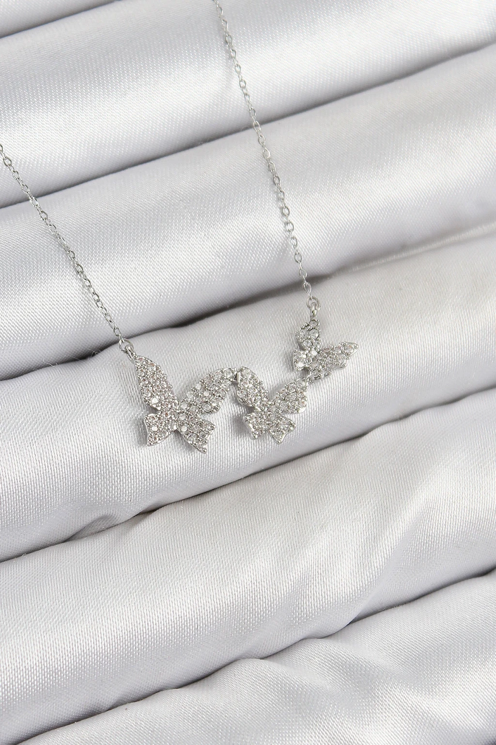 Pirinç Zirkon Taşlı Kelebek Model Gümüş Renk Kadın Kolye - TJ-BKO10425