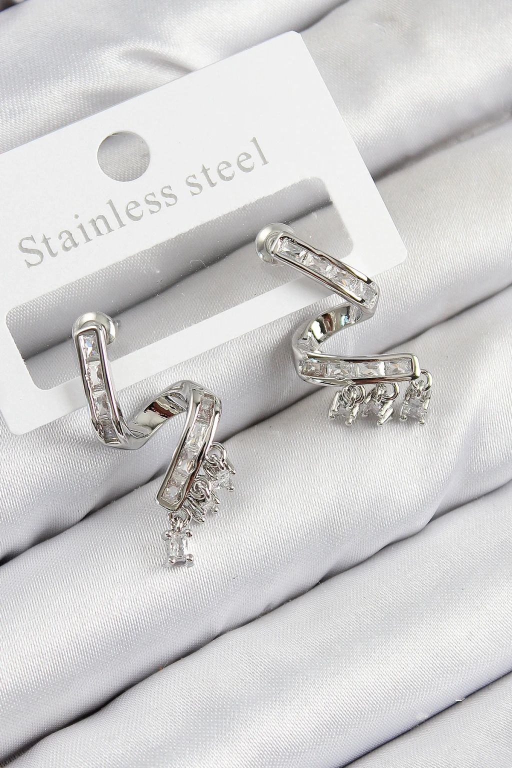 Pirinç Zirkon Taşlı Kıvrımlı Model Gümüş Renk Kadın Küpe - TJ-BKP11113