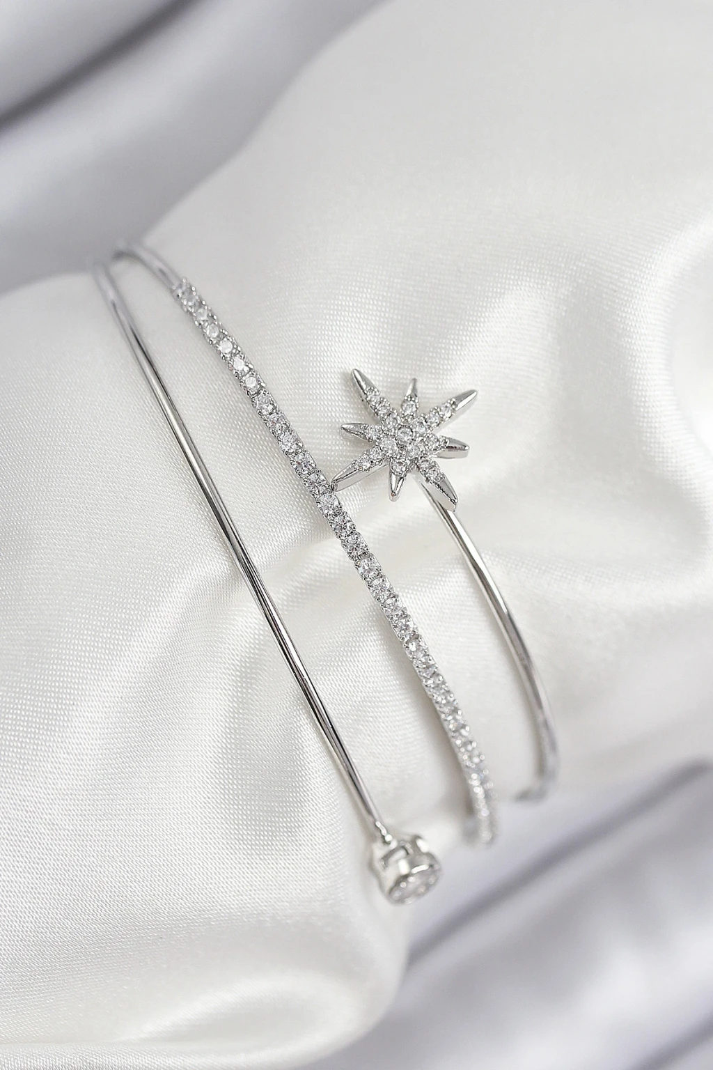 Pirinç Zirkon Taşlı Kutup Yıldızı Model Gümüş Renk Kadın Bileklik - TJ-BB7888