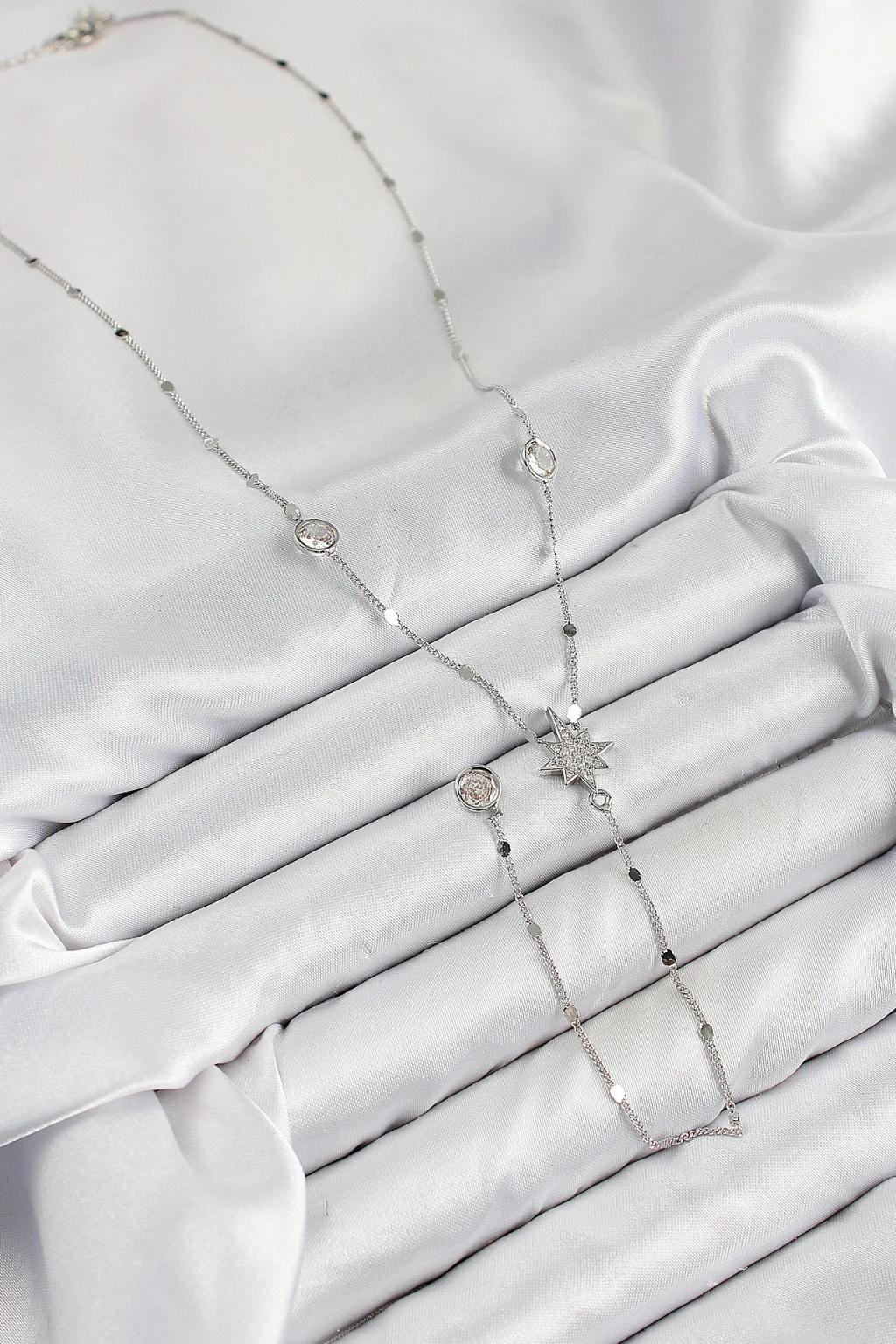 Pirinç Zirkon Taşlı Kutup Yıldızı Model Gümüş Renk Y Kolye - TJ-BKO10453