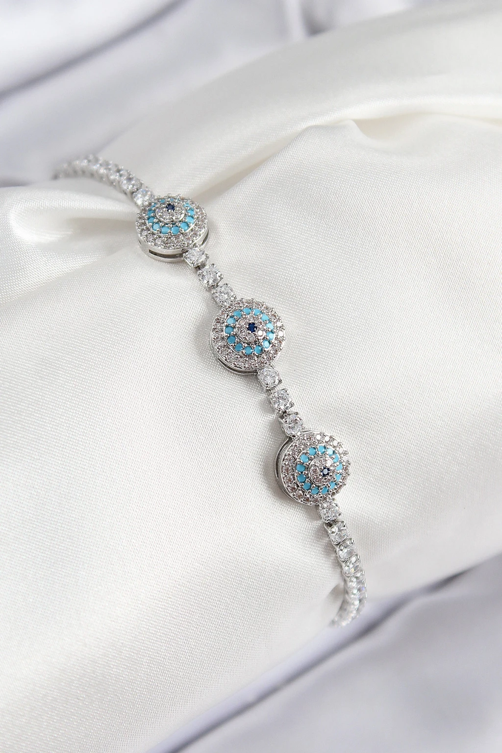 Pirinç Zirkon Taşlı Nazar Model Gümüş Renk Kadın Bileklik - TJ-BB7704