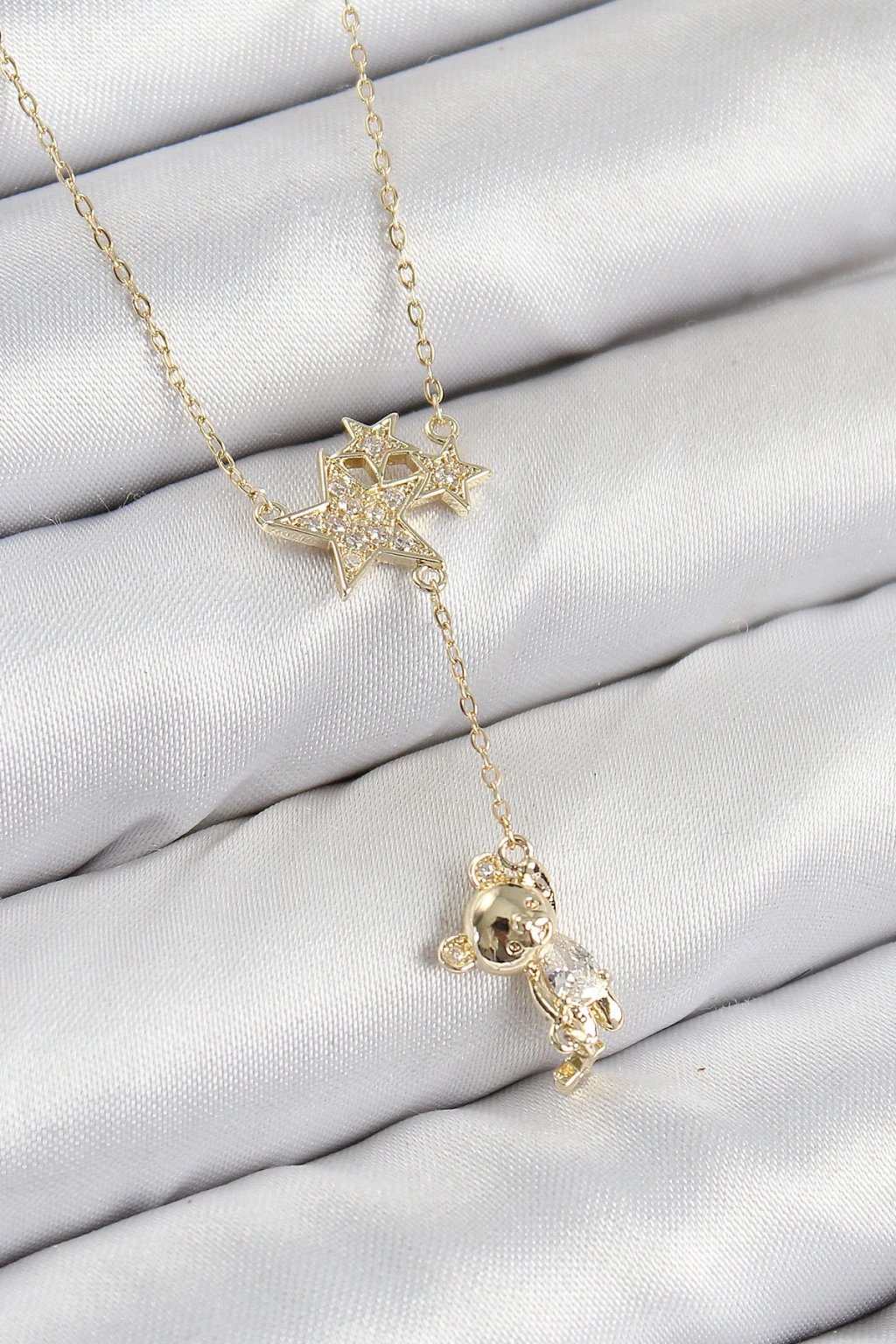 Pirinç Zirkon Taşlı Sallantılı Ayıcıklı Yıldız Model Gold Renk Kadın Kolye - TJ-BKO10418