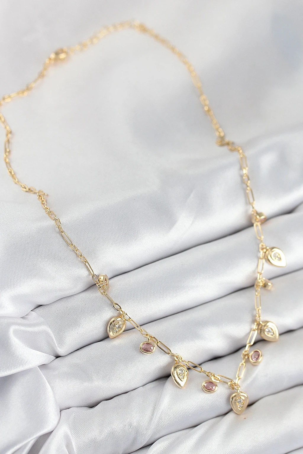 Pirinç Zirkon Taşlı Sallantılı Damla Model Gold Renk Kadın Kolye - TJ-BKO10492