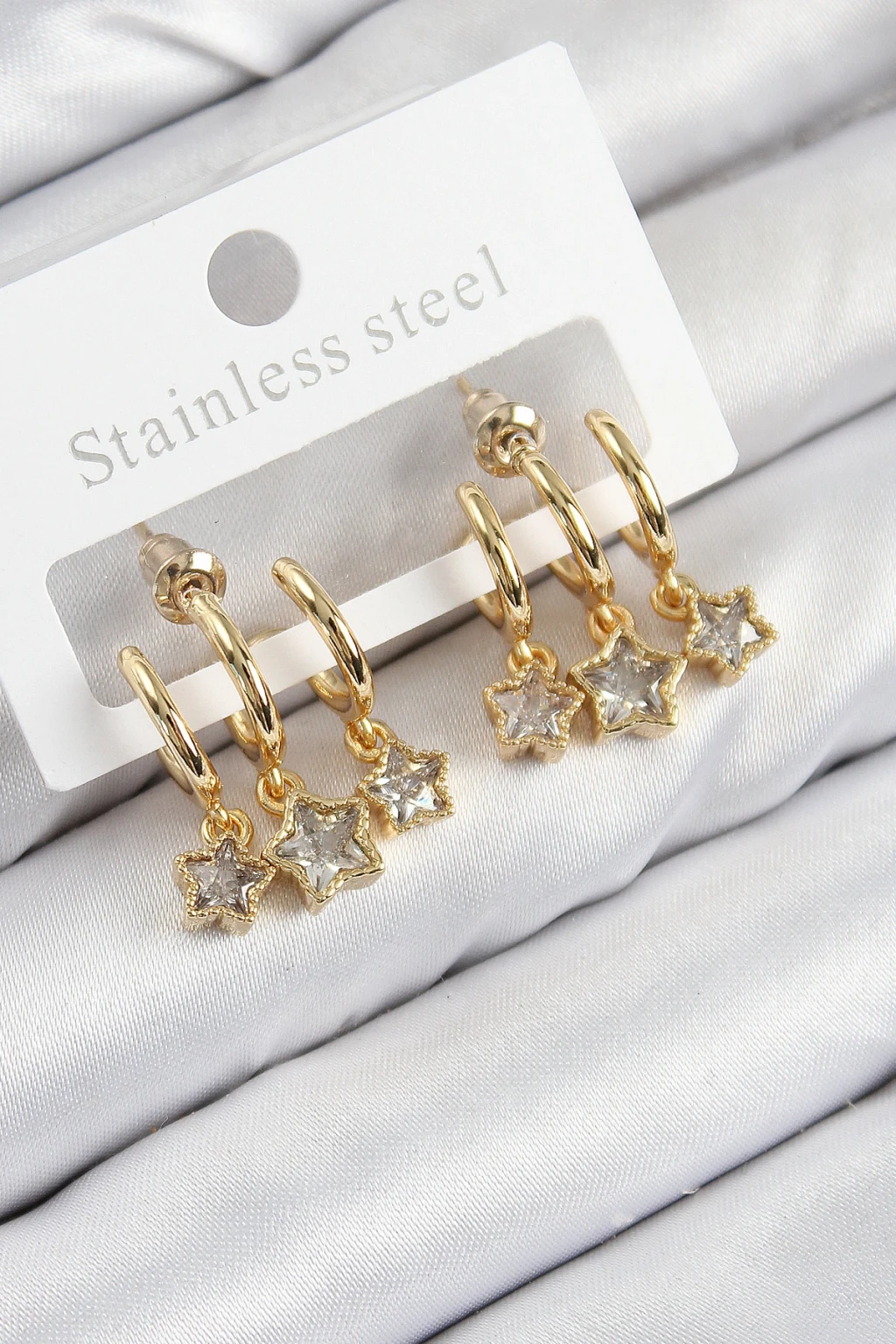 Pirinç Zirkon Taşlı Sallantılı Yıldız Model Gold Renk Kadın Küpe - TJ-BKP11105
