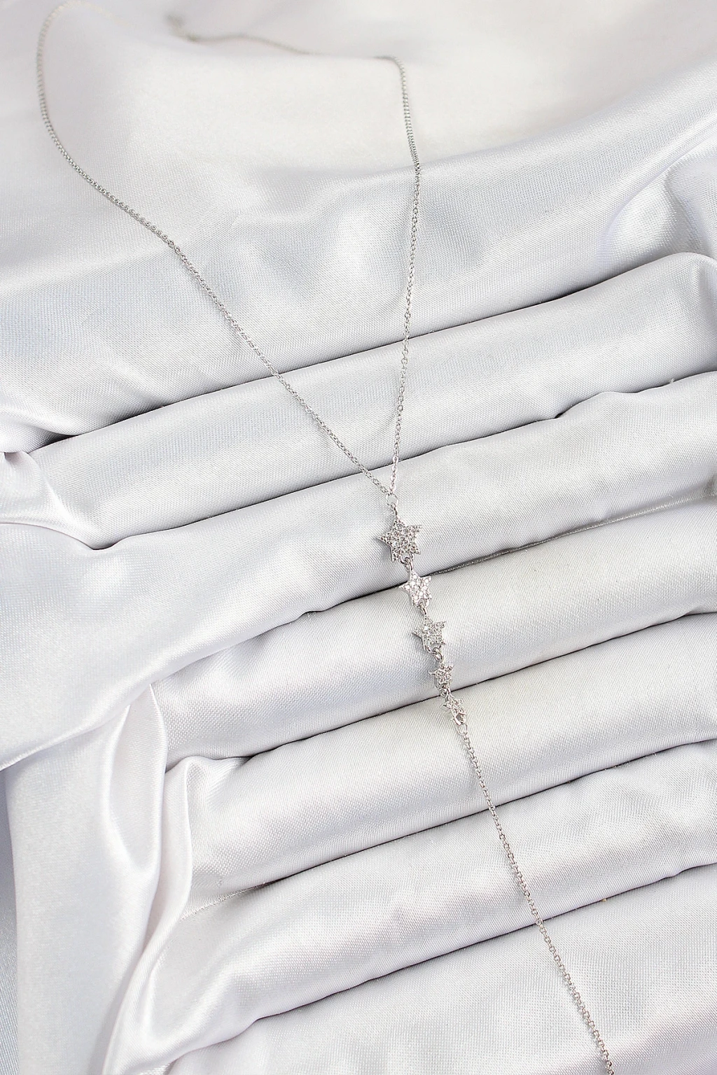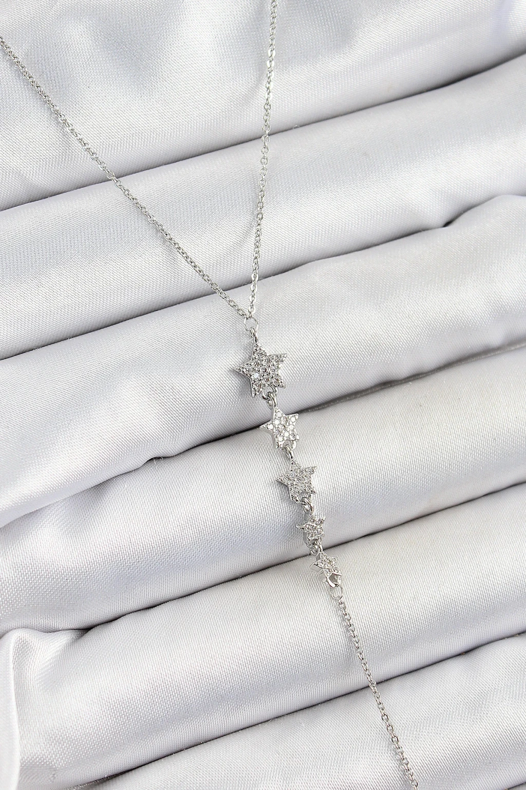 Pirinç Zirkon Taşlı Sıralı Yıldız Figürlü Y Model Gümüş Renk Kadın Kolye - TJ-BKO10313