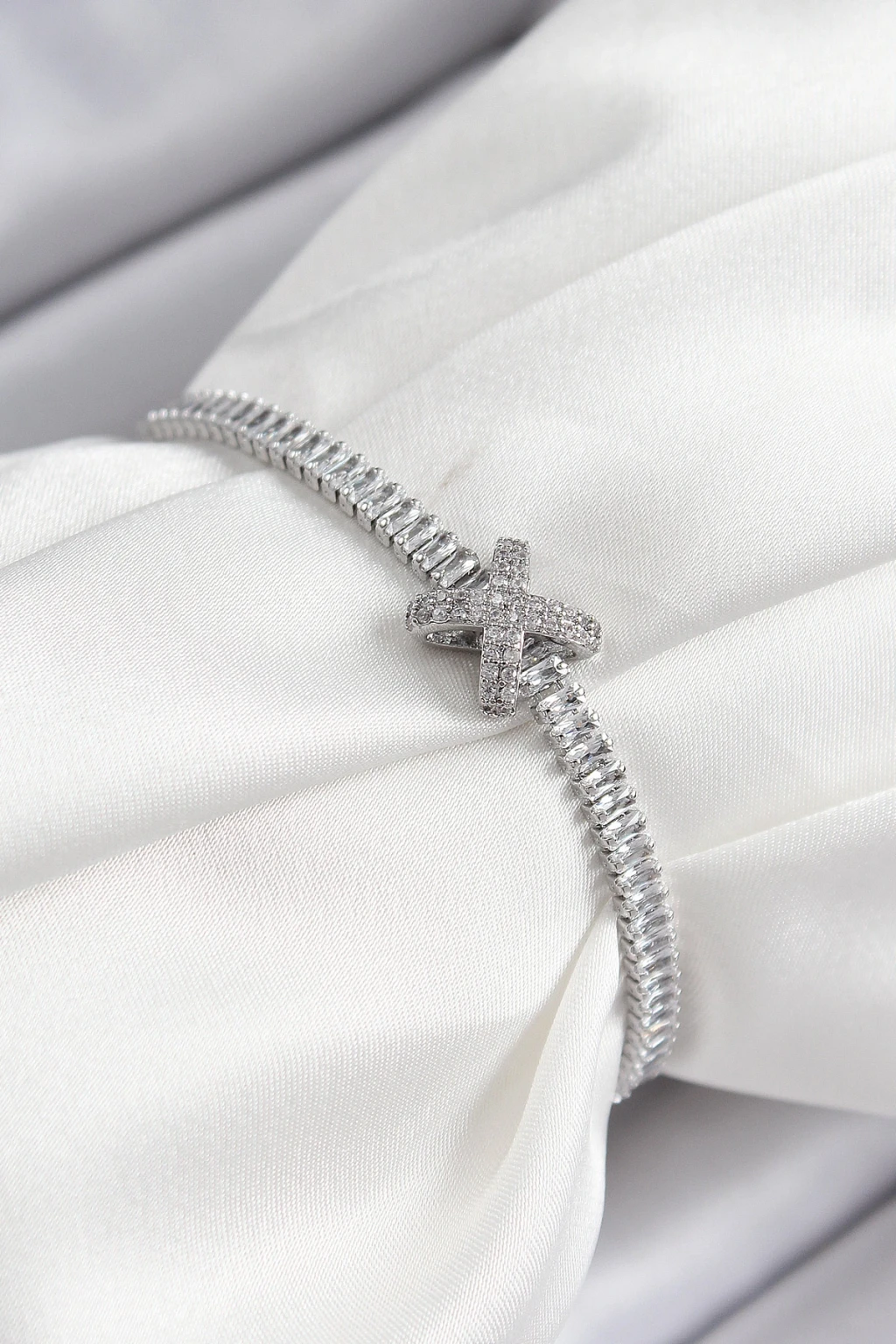Pirinç Zirkon Taşlı X Detaylı Su Yolu Model Gümüş Renk Asansörlü Kadın Bileklik - TJ-BB7467
