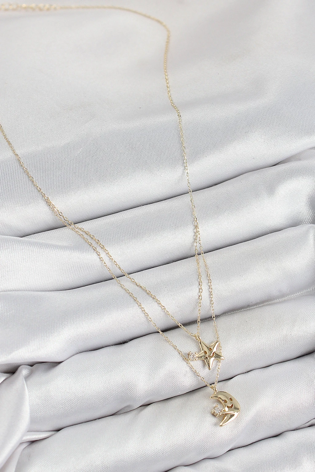 Pirinç Zirkon Taşlı Yıldız Ve Ay Model Gold Renk Kadın Kolye - TJ-BKO10422