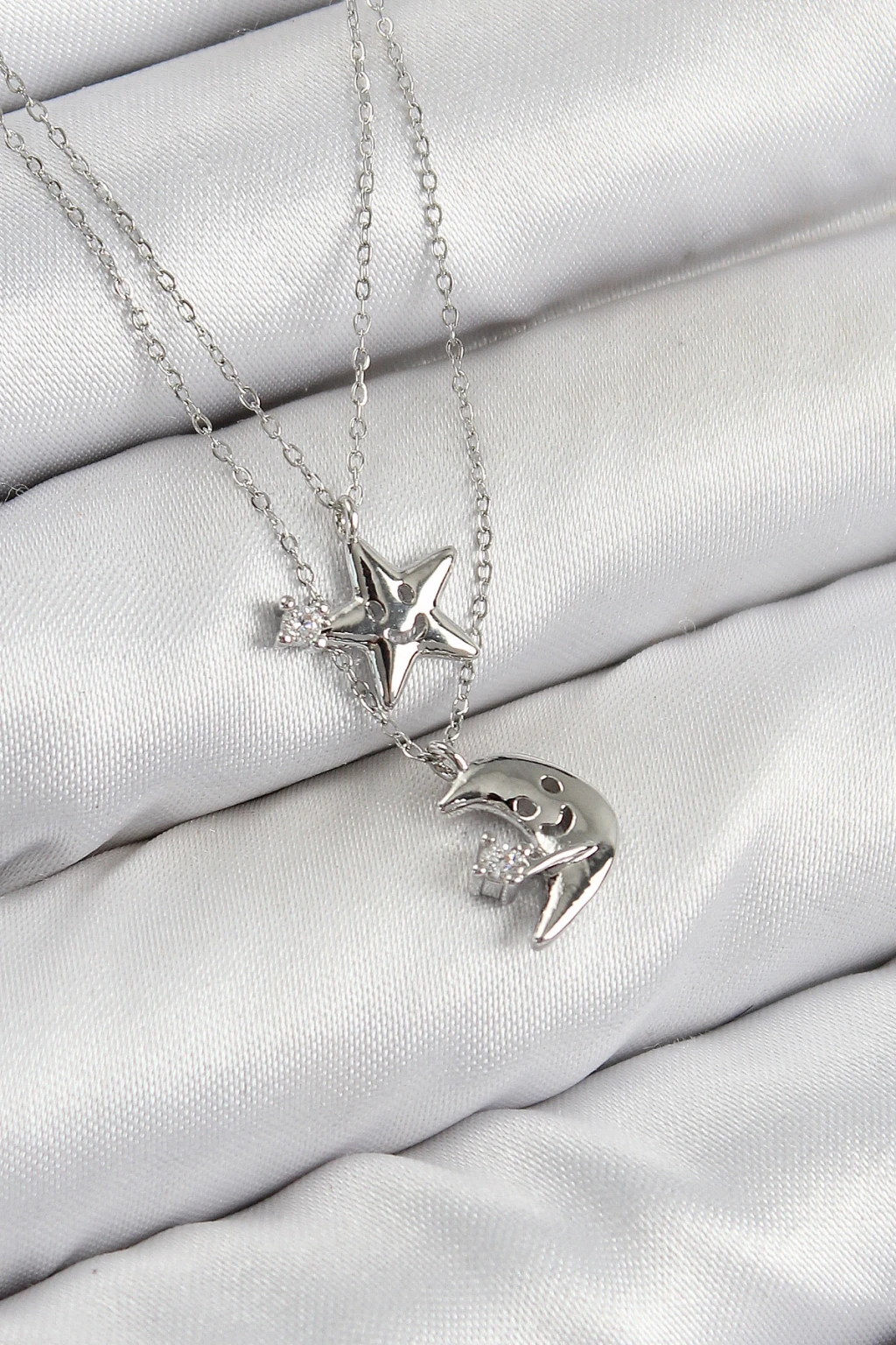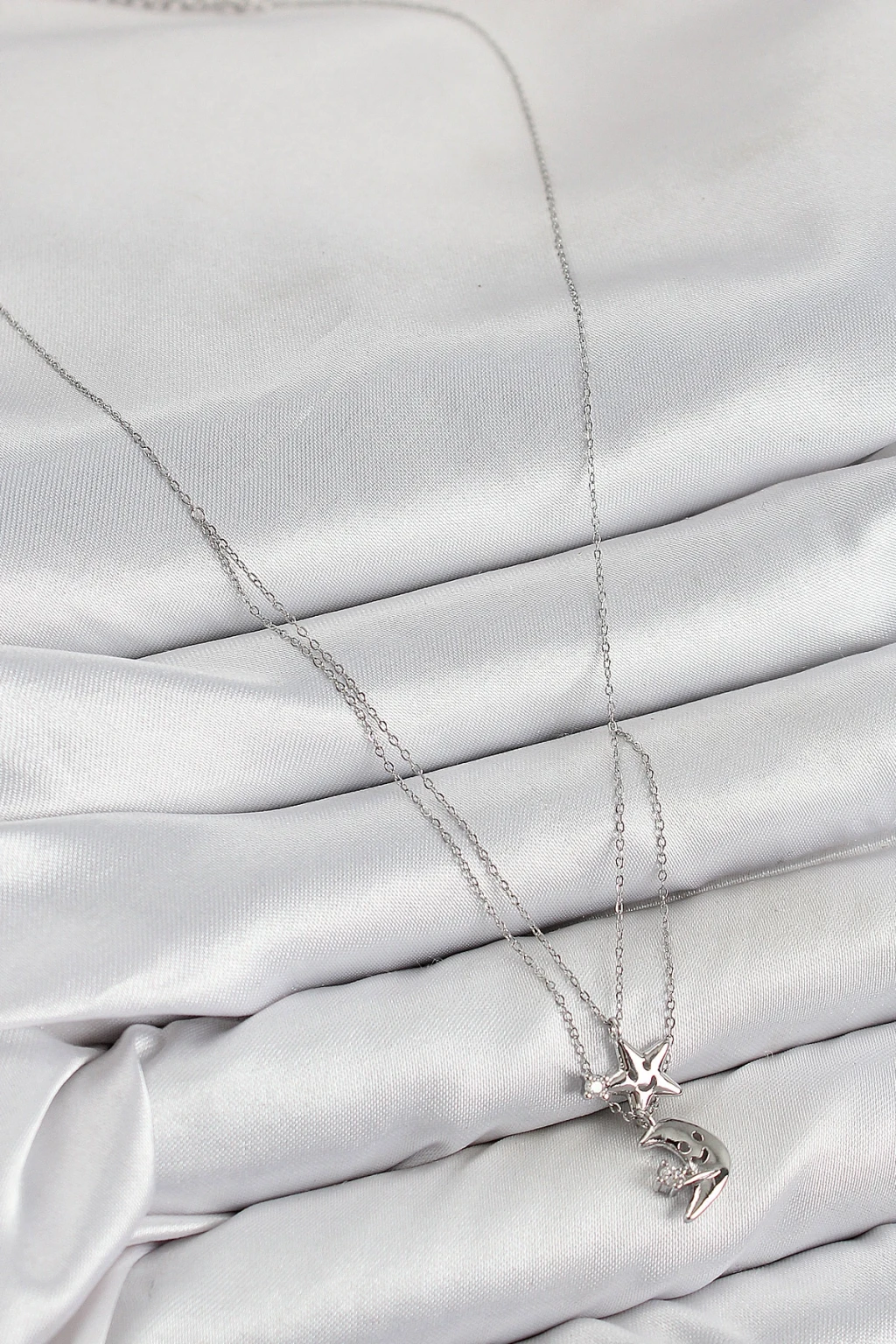Pirinç Zirkon Taşlı Yıldız Ve Ay Model Gümüş Renk Kadın Kolye - TJ-BKO10423