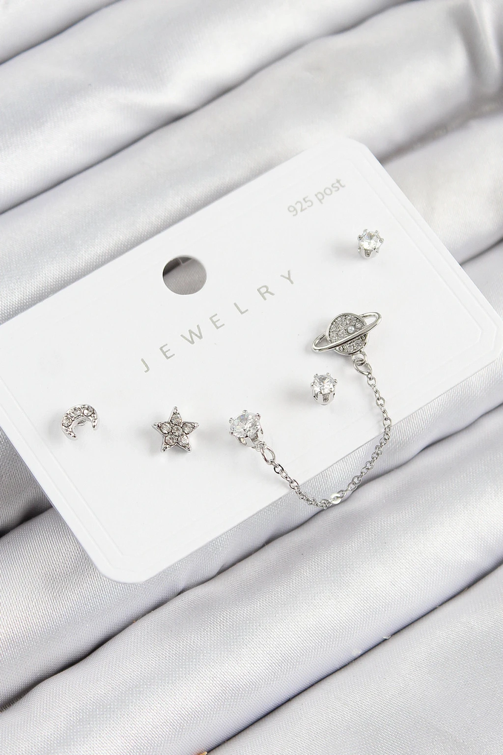Pirinç Zirkon Taşlı Yıldız Ve Gezegen Model Gümüş Renk 925 Ayar Gümüş Çivi Kadın Küpe Set - TJ-BKP11153