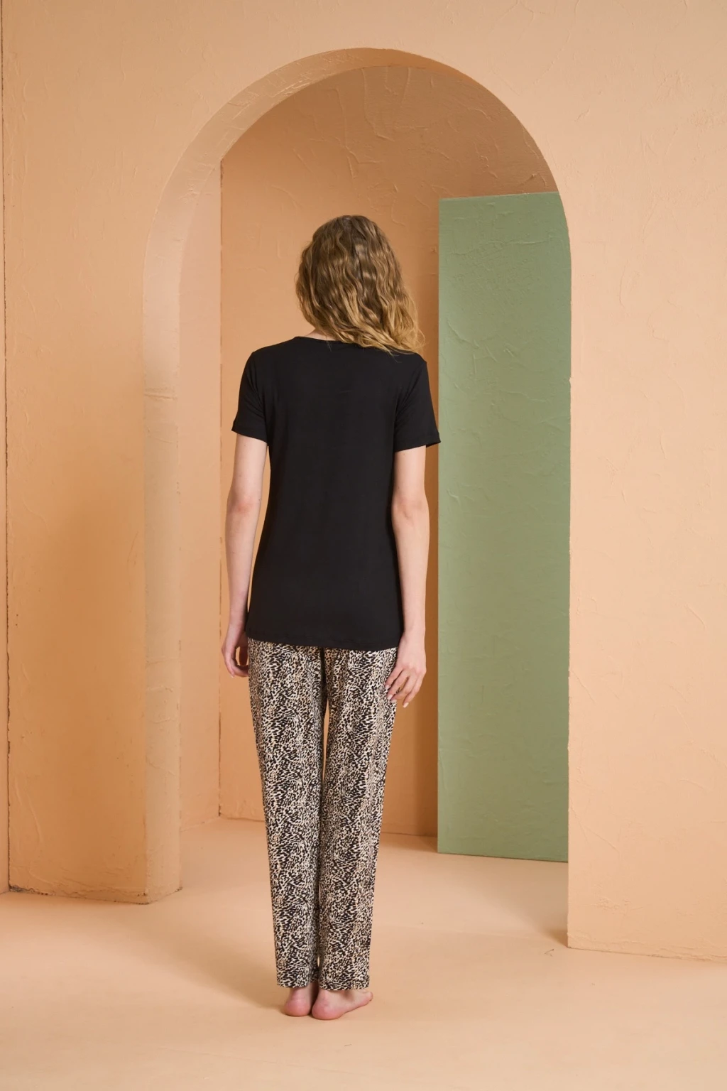 Siyah Likralı Düğmeli Yumuşacık 2li Pijama Takımı