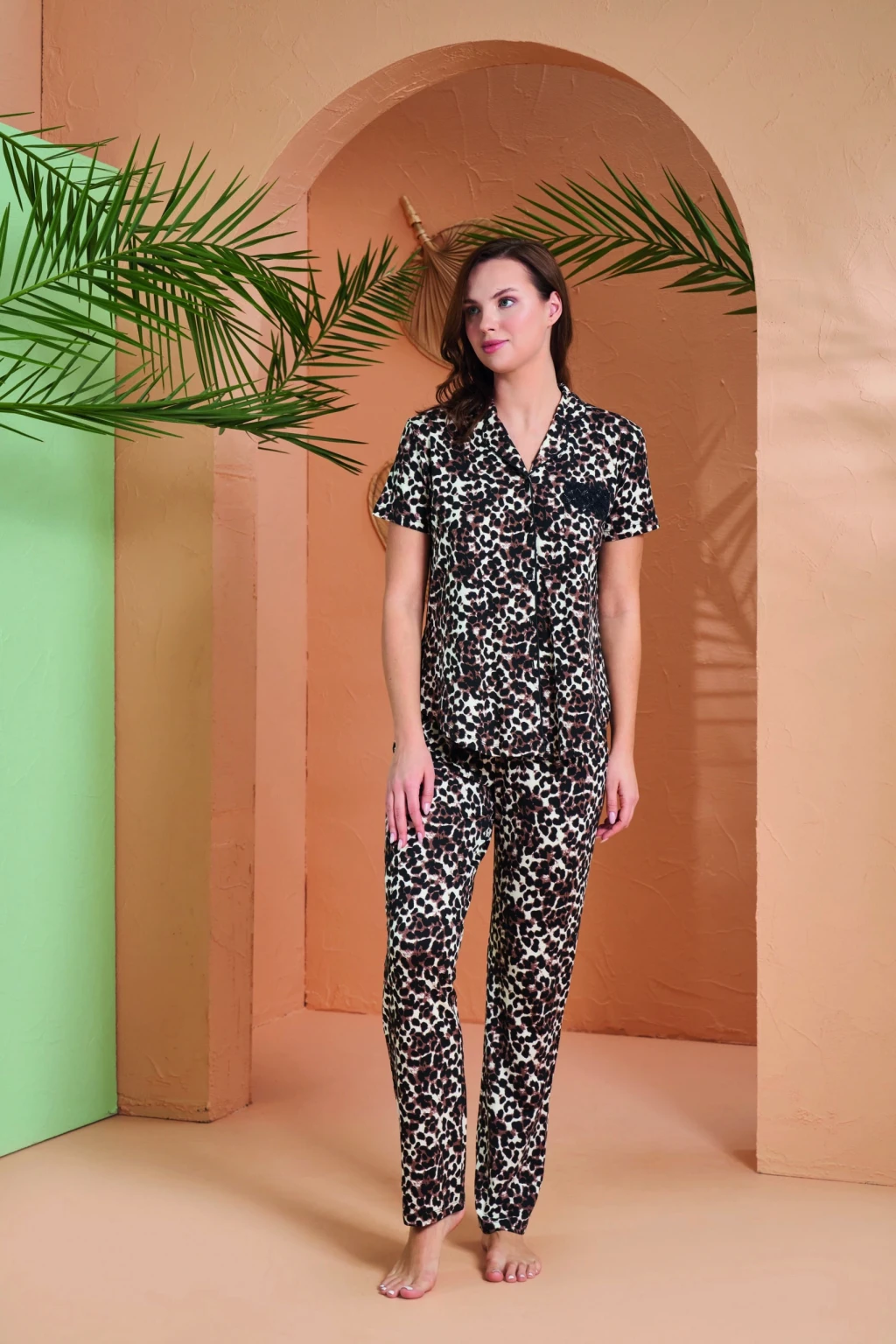 Kadın Leopar Dantel Detaylı Şortlu Gecelik Pijama Takımı 5055