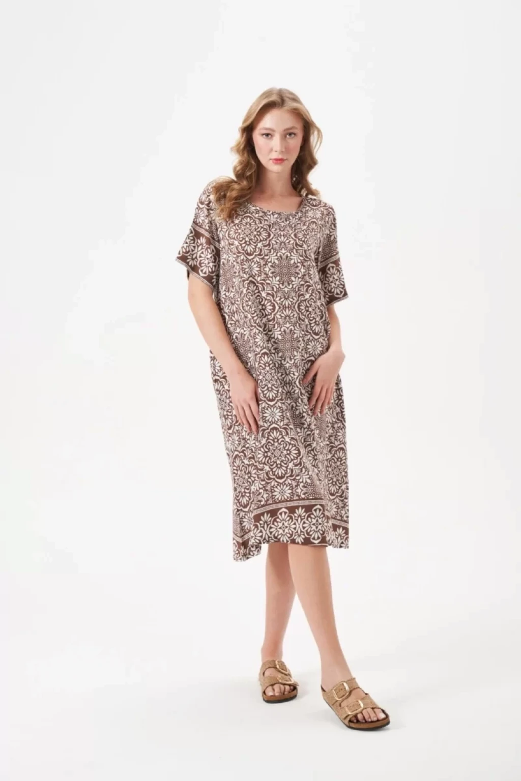 Kuş Ve Yaprak Desenli Önü Düğmeli Elbise