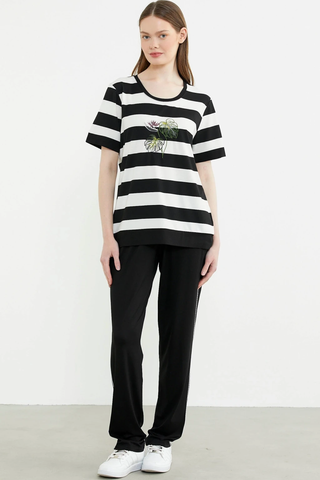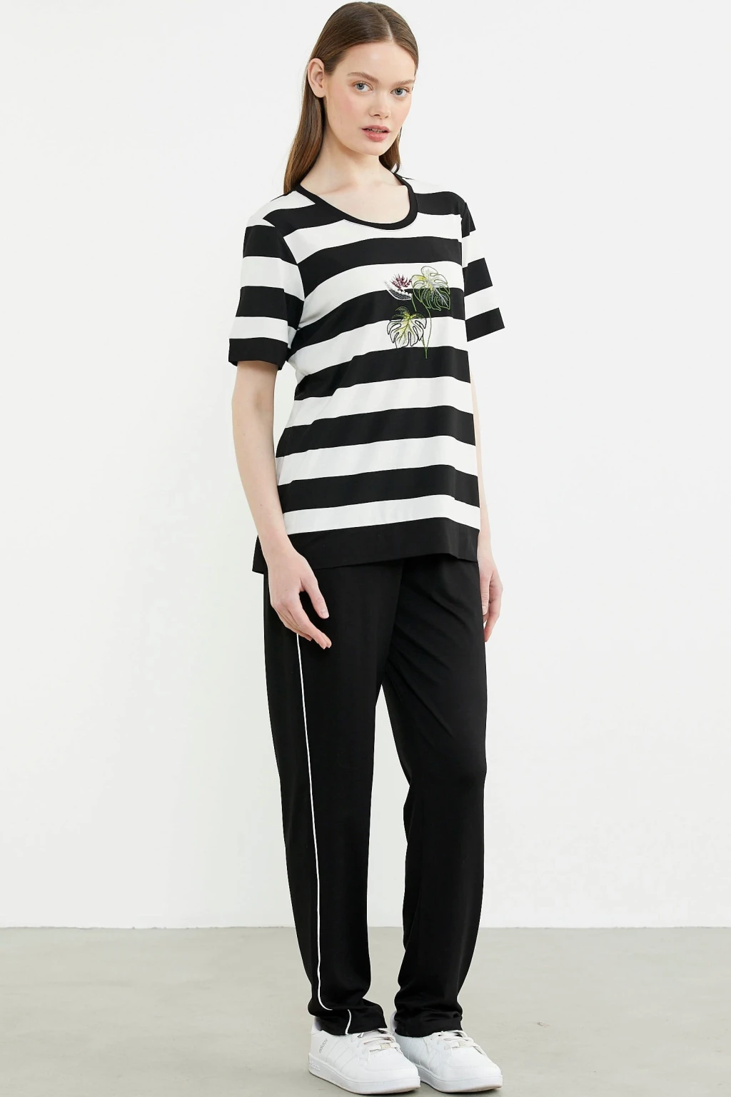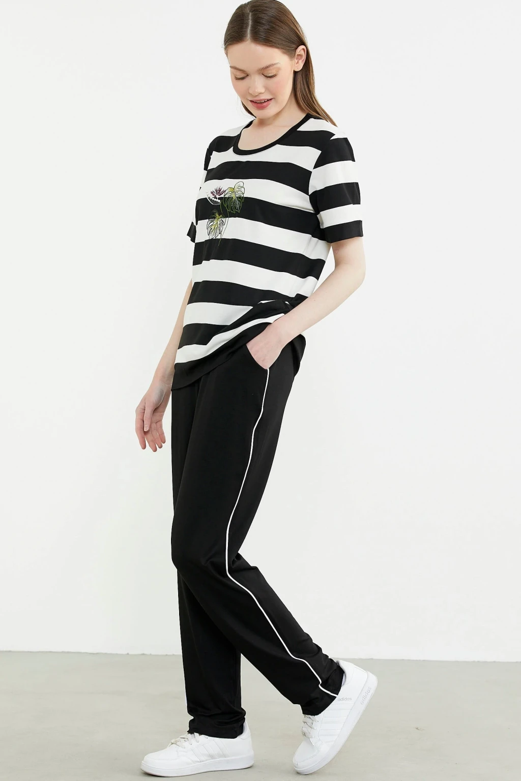 Siyah Likralı Düğmeli Yumuşacık 2li Pijama Takımı