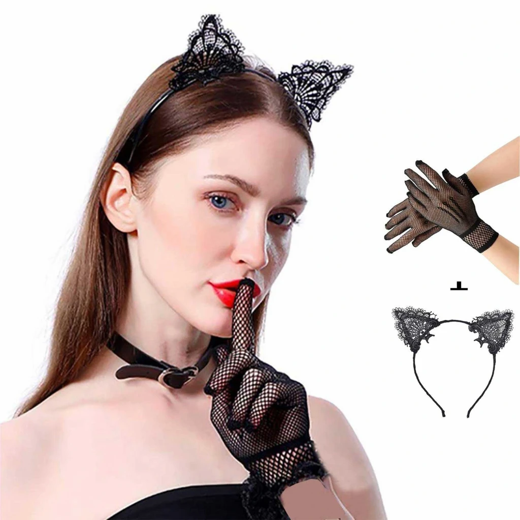 Siyah Kedi Dantel Taç + Eldiven Seti – Parti, Dans ve Kostüm Kombini
