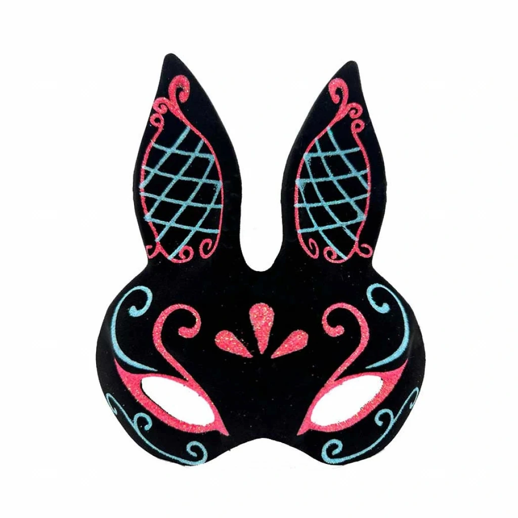 Gizemli ve göz alıcı bir görünüm için siyah süet kaplama, mavi kırmızı simli tavşan maskemiz tam size göre!