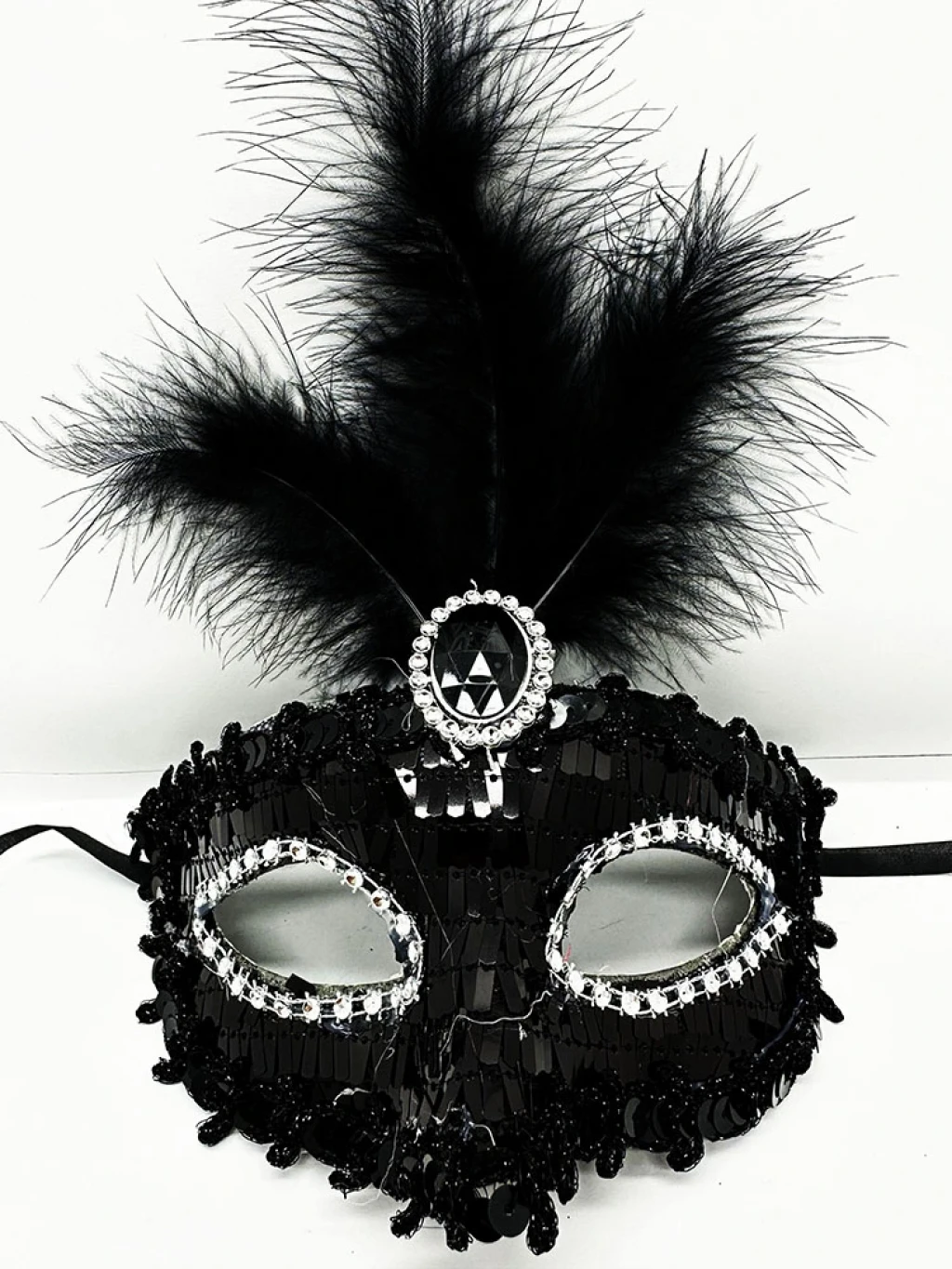 Siyah Renk Payetli Pullu Tüylü Parti Maskesi Ürün Ölçüsü : 17x20 cm ( Tüy Dahil ) Kaliteli plastik malzemeden üretilmiştir Maske üzeri parlak payetli pullarla kaplıdır İp aparatı sayesinde yüze göre uyum sağlar ve yüzden düşmez