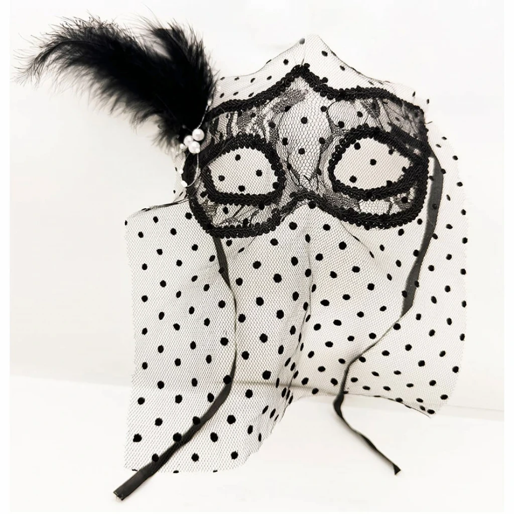 Siyah Renk Siyah Puantiyeli Duvaklı İncili Parti Maskesi