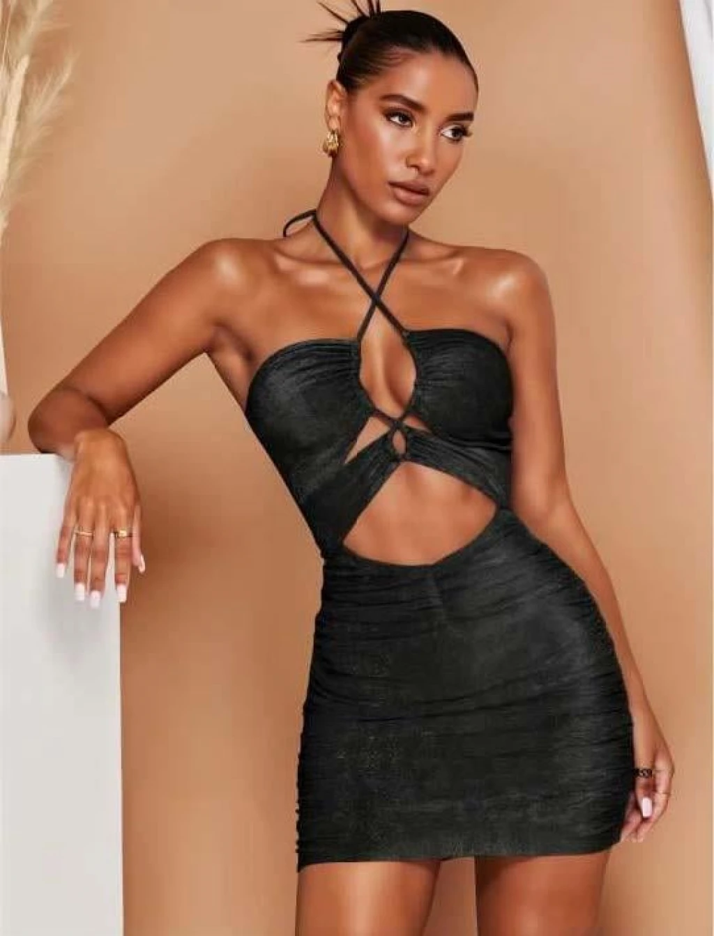Siyah Simli Boyundan Bağlamalı Göğüs Dekolteli Mini Club Elbisesi