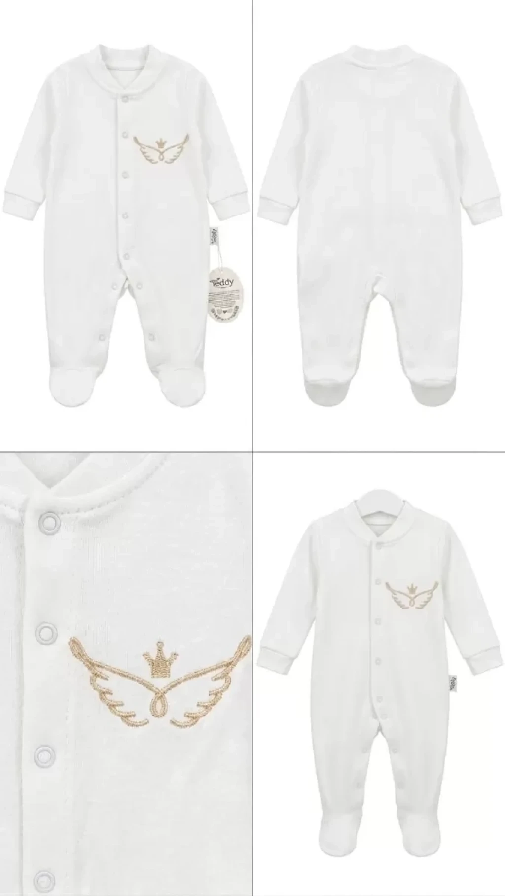 İleri nakış teknolojisi ile tasarlanmıştır. Üzerinde kullanılan çıtçıt bebek tenine temas etmemektedir. Ürünlerimizde polyester iplik kesinlikle kullanılmaz. Kullanılan ipler pamuklu veya viskon karışımlı iplerdir. Ürünlerimizin kol birleştirme, yaka birleştirme, pantolon ağ birleştirme vb. yerlerinde ki dikişler de, ürünün kullanımı esnasında, zorlanarak zarar görmesini engellemek amacıyla belirtilen kısımlarda, ekstra güçlendirilmiş dikiş şekli olan ÇİMA dikişi uygulanması şarttır. Ürünlerimizde, beden etiket numarası ve yıkama talimatı bilgilerinin ürün ensesine, ense baskısı şeklinde ve ekolojik boyalar ile boya baskı olarak uygulanmaktadır. Ürünlerimizde kullanılan çıtçıtlar nikel free sertifikalı, ekstra kaliteli çıtçıtlardır. Çıtçıt ve düğme yerleri (detayları), bebek yatarken kesinlikle bebeğe zarar vermeyecek yerlere gelecek şekilde tasarlanmıştır. Ürünlerimizde, fermuar vb. aksesuarlar uluslararası standartlarda, anne ve bebek sağlığına zarar vermeyecek şekildeki sertifikalı markalardan ve modellerden kullanılır. Ürünlerimizde, bebeğin tenine temas eden yüzeylerde, nakış arkası vb. riskli yüzeylerde ve bebeğin tenini tahriş etme olasılığı olan tüm detaylarda mutlaka tela vb. yapıştırılarak, bebeğin zarar görmesini engelleyecek gerekli önlemlerin alınması şarttır. Ürünlerimizde kullandığımız kumaş, tül, dantel vb. malzemelerin tamamının antialerjik ve anti bakteriyel özelliklerde ki malzemelerden üretilmiş olması şarttır.